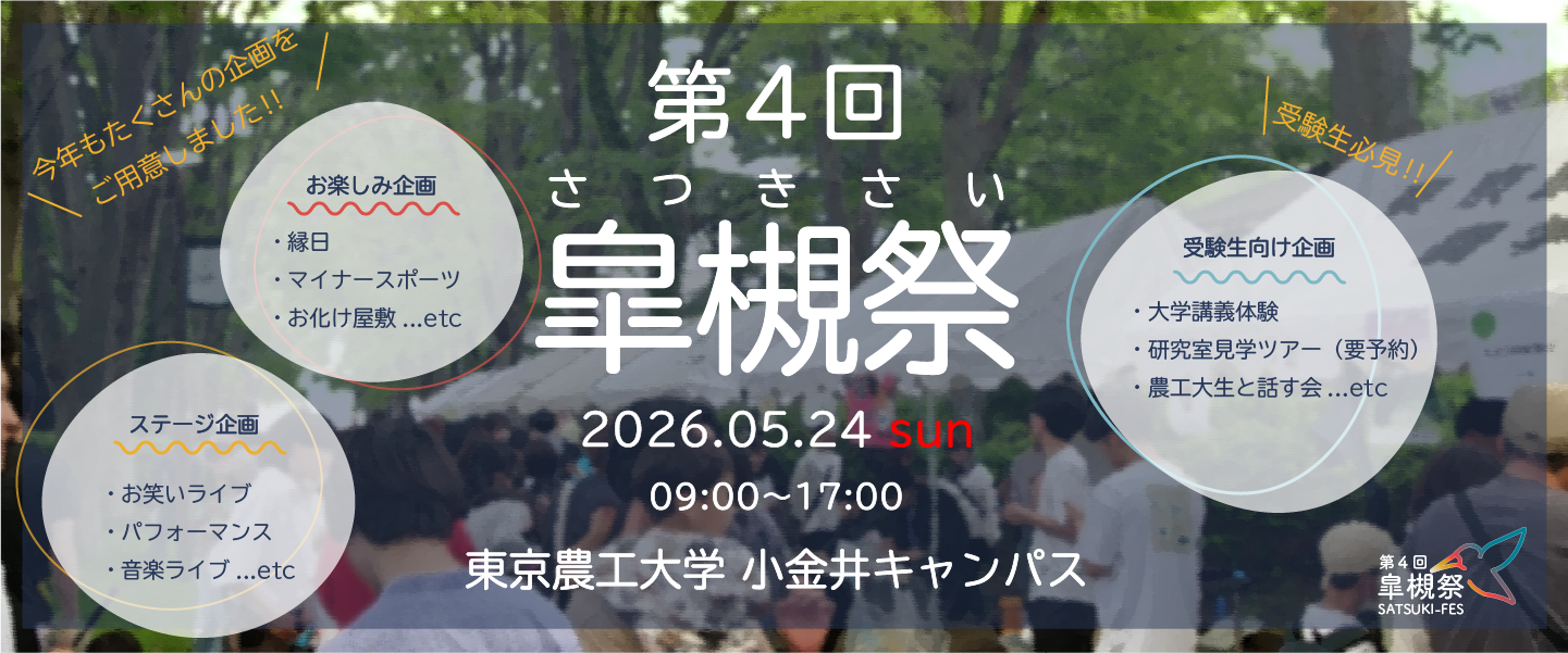 RESEARCH 東京農工大学が進める先端的な研究を紹介 PICK UP 東京農工大学の旬な情報をピックアップ EDUCATION FLOuRISHフェローシップ事業 FL-SPRING/FL-BOOST 博士後期課程学生を対象として、高度な専門性と学際的な視点を持った「真の理系高度イノベーションリーダー人材」の育成を行います。 RESEARCH 東京農工大学 J-PEAKSホームページ 西東京三大学が、「食とエネルギー」に関する研究を国内・海外に展開し、国際的なイノベーションを創出するための研究力強化を推進しています。 TOPICS 西東京国際イノベーション共創拠点/邂逅館 西東京国際イノベーション共創拠点/邂逅館についてのご案内です。 TOPICS ネーミングライツのご案内 本学の施設に愛称等を付けていただくネーミングライツパートナーを募集しています。 TOPICS 東京農工大学基金 東京農工大学基金のご案内です。 TOPICS 小金井動物救急医療センター開院のおしらせ 小金井キャンパスに動物救急医療センターが開院しました。 EDUCATION 大学院先進学際科学府(修士課程)設置 2025年4月設置 TOPICS Dejima Intelligence株式会社設立 東京農工大学100%出資のDejima Intelligence株式会社が事業を開始しました。 EDUCATION 卓越大学院プログラム 高度博士人材を養成 TOPICS ハッケンコウケンの研究探訪・教育探訪 公式キャラクター「ハッケンコウケン」が研究や授業の様子を紹介 RESEARCH・EVENT グローバルイノベーション研究院 公開セミナー等のお知らせ RESEARCH JST COI-NEXT(共創分野・本格型) 炭素循環型社会実現のためのカーボンネガティブの限界に挑戦する炭素耕作拠点 RESEARCH 西東京三大学共同サステイナビリティ国際社会実装研究センター 多摩地区三大学が持続可能社会に向けた研究を推進しています。 NEWS ニュース RSS すべて 入試 教育 研究 教職員の受賞 学生の活躍 来訪・交流 行事・イベント お知らせ 2026年4月2日 研究 (研究成果の発表)植物が青色光でデンプンを分解し気孔を開く仕組みを解明 −青色光受容体フォトトロピンの新たな基質WDR48を発見− 2026年4月2日 研究 (研究成果の発表)衝撃が生む液体の「バンジージャンプ」現象の謎を解明 ー 複雑な粘弾性ジェットの動きは「単純なモデル」で記述できた ー 2026年4月1日 研究 (研究成果の発表)だだちゃ®豆のおいしさを決める遺伝子を発見 ~早生化遺伝子tof11は枝豆の高遊離アミノ酸化をもたらし食味を向上させる~ 2026年4月8日 学生の活躍 「東京農工大学遠藤章奨学金」奨学生へ奨学生証書を授与 2026年4月8日 学生の活躍 農学府農学専攻1年の中ノ森月菜さんが日本雑草学会「ベストポスター賞」を受賞 2026年4月8日 学生の活躍 連合農学研究科博士特別研究生の及川航貴さんがアメリカ土壌科学会「Top cited article」を受賞 2026年4月7日 行事・イベント 令和8年度入学式を挙行 2026年4月6日 学生の活躍 生物システム応用科学府一貫制博士課程食料エネルギーシステム科学専攻3年の佐原晃太さんが化学工学会第91年会「優秀学生賞」を受賞 2026年4月6日 学生の活躍 知能情報システム工学科4年の磯本惣太郎さんが情報処理学会EC研究会第79回研究発表会「研究奨励賞 銀賞」を受賞 2026年3月13日 入試 東京農工大学連合農学研究科に『微細構造分析学』を開講 ~陸域と海域の学問分野をつなぐ人材育成を目指して~ 2026年3月10日 入試 令和10(2028)年度入学者選抜工学部募集人員の一部変更について(予告) 2026年1月19日 入試 大学入学共通テスト(追試験)を本学で受験される方へ 2025年10月27日 入試 令和8(2026)年度「一般選抜学生募集要項」の公表について 2025年8月27日 入試 令和8(2026)年度「特別選抜学生募集要項」の公表について 2025年8月27日 入試 令和8(2026)年度「学校推薦型選抜学生募集要項」の公表について 2026年2月26日 教育 【募集】令和8年度春季募集「次世代研究者挑戦的研究プログラム」(SPRING)・「次世代 AI 人材育成プログラム」(BOOST)について 2025年12月15日 教育 【募集】令和9(2027)年4月入学者対象「次世代研究者挑戦的研究プログラム(FL-SPRING)」早期選考について 2025年8月27日 教育 【募集】令和7年度秋季募集 「次世代研究者挑戦的研究プログラム 」FL-SPRINGについて 2026年4月3日 研究 QS分野別世界大学ランキング2026農学・森林科学分野において世界第41位(国内第1位)を獲得 2026年3月31日 研究 (研究成果の発表)ごくわずかな量の高山植物の花サンプルから新たに開発した手法により多様なフェノール化合物の構造決定に成功 2026年3月24日 研究 (研究成果の発表)地球温暖化から逃避する樹木と哺乳類・鳥類との関係 -野生のサクラの種子散布に果たすクマの役割- 2026年3月19日 研究 小型ロボット群による協調探査実験をオーストラリアの地下洞窟で実施 2026年3月17日 研究 (研究成果の発表)リチウムナイオベート振動子を用いて高周波の超音波を照射することにより細胞内に活性酸素種を産生 2026年3月16日 研究 (研究成果の発表)精密構造が切り拓く次世代光検出技術 ― エピタキシャルコロイド量子ドット超格子による高性能光検出器の実証 ― 2026年4月3日 教職員の受賞 倉科佑太