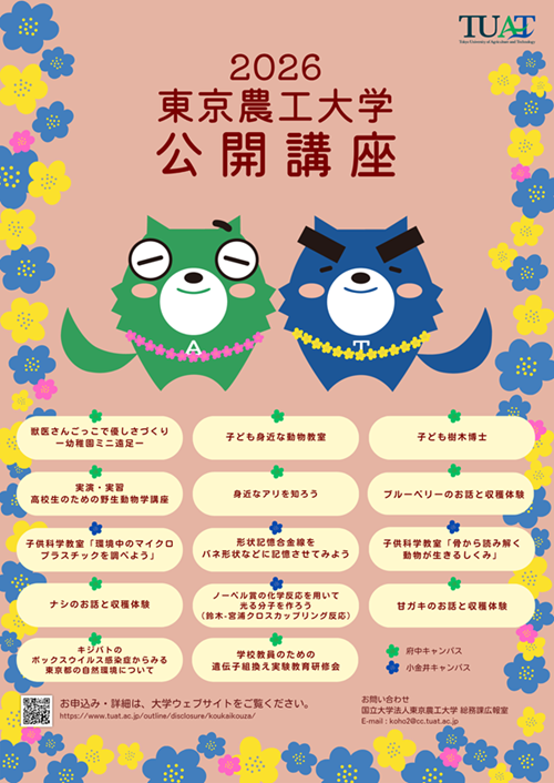 RESEARCH 東京農工大学が進める先端的な研究を紹介 PICK UP 東京農工大学の旬な情報をピックアップ EDUCATION FLOuRISHフェローシップ事業 FL-SPRING/FL-BOOST 博士後期課程学生を対象として、高度な専門性と学際的な視点を持った「真の理系高度イノベーションリーダー人材」の育成を行います。 RESEARCH 東京農工大学 J-PEAKSホームページ 西東京三大学が、「食とエネルギー」に関する研究を国内・海外に展開し、国際的なイノベーションを創出するための研究力強化を推進しています。 TOPICS 西東京国際イノベーション共創拠点/邂逅館 西東京国際イノベーション共創拠点/邂逅館についてのご案内です。 TOPICS ネーミングライツのご案内 本学の施設に愛称等を付けていただくネーミングライツパートナーを募集しています。 TOPICS 東京農工大学基金 東京農工大学基金のご案内です。 TOPICS 小金井動物救急医療センター開院のおしらせ 小金井キャンパスに動物救急医療センターが開院しました。 EDUCATION 大学院先進学際科学府(修士課程)設置 2025年4月設置 TOPICS Dejima Intelligence株式会社設立 東京農工大学100%出資のDejima Intelligence株式会社が事業を開始しました。 EDUCATION 卓越大学院プログラム 高度博士人材を養成 TOPICS ハッケンコウケンの研究探訪・教育探訪 公式キャラクター「ハッケンコウケン」が研究や授業の様子を紹介 RESEARCH・EVENT グローバルイノベーション研究院 公開セミナー等のお知らせ RESEARCH JST COI-NEXT(共創分野・本格型) 炭素循環型社会実現のためのカーボンネガティブの限界に挑戦する炭素耕作拠点 RESEARCH 西東京三大学共同サステイナビリティ国際社会実装研究センター 多摩地区三大学が持続可能社会に向けた研究を推進しています。 NEWS ニュース RSS すべて 入試 教育 研究 教職員の受賞 学生の活躍 来訪・交流 行事・イベント お知らせ 2026年4月2日 研究 (研究成果の発表)植物が青色光でデンプンを分解し気孔を開く仕組みを解明 −青色光受容体フォトトロピンの新たな基質WDR48を発見− 2026年4月2日 研究 (研究成果の発表)衝撃が生む液体の「バンジージャンプ」現象の謎を解明 ー 複雑な粘弾性ジェットの動きは「単純なモデル」で記述できた ー 2026年4月1日 研究 (研究成果の発表)だだちゃ®豆のおいしさを決める遺伝子を発見 ~早生化遺伝子tof11は枝豆の高遊離アミノ酸化をもたらし食味を向上させる~ 2026年4月9日 お知らせ 中東情勢の緊迫化に伴う海外渡航に関する注意喚起 2026年4月9日 学生の活躍 農学府農学専攻修了生の河野啓太さんが第73回日本生態学会大会「ポスター賞優秀賞」を受賞 2026年4月9日 教職員の受賞 山井成良教授が「情報処理学会フェロー」に認定 2026年4月8日 学生の活躍 「東京農工大学遠藤章奨学金」奨学生へ奨学生証書を授与 2026年4月8日 学生の活躍 農学府農学専攻1年の中ノ森月菜さんが日本雑草学会「ベストポスター賞」を受賞 2026年4月8日 学生の活躍 連合農学研究科博士特別研究生の及川航貴さんがアメリカ土壌科学会「Top cited article」を受賞 2026年3月13日 入試 東京農工大学連合農学研究科に『微細構造分析学』を開講 ~陸域と海域の学問分野をつなぐ人材育成を目指して~ 2026年3月10日 入試 令和10(2028)年度入学者選抜工学部募集人員の一部変更について(予告) 2026年1月19日 入試 大学入学共通テスト(追試験)を本学で受験される方へ 2025年10月27日 入試 令和8(2026)年度「一般選抜学生募集要項」の公表について 2025年8月27日 入試 令和8(2026)年度「特別選抜学生募集要項」の公表について 2025年8月27日 入試 令和8(2026)年度「学校推薦型選抜学生募集要項」の公表について 2026年2月26日 教育 【募集】令和8年度春季募集「次世代研究者挑戦的研究プログラム」(SPRING)・「次世代 AI 人材育成プログラム」(BOOST)について 2025年12月15日 教育 【募集】令和9(2027)年4月入学者対象「次世代研究者挑戦的研究プログラム(FL-SPRING)」早期選考について 2025年8月27日 教育 【募集】令和7年度秋季募集 「次世代研究者挑戦的研究プログラム 」FL-SPRINGについて 2026年4月3日 研究 QS分野別世界大学ランキング2026農学・森林科学分野において世界第41位(国内第1位)を獲得 2026年3月31日 研究 (研究成果の発表)ごくわずかな量の高山植物の花サンプルから新たに開発した手法により多様なフェノール化合物の構造決定に成功 2026年3月24日 研究 (研究成果の発表)地球温暖化から逃避する樹木と哺乳類・鳥類との関係 -野生のサクラの種子散布に果たすクマの役割- 2026年3月19日 研究 小型ロボット群による協調探査実験をオーストラリアの地下洞窟で実施 2026年3月17日 研究 (研究成果の発表)リチウムナイオベート振動子を用いて高周波の超音波を照射することにより細胞内に活性酸素種を産生 2026年3月16日 研究 (研究成果の発表)精密構造が切り拓く次世代光検出技術 ― エピタキシャルコロイド量子ドット超格子による高性能光検出器の実証 ― 2026年4月9日 教職員の受賞 山井成良教授が「情報処理学会フェロー」に認定 2026年4月3日 教職員の受賞 倉科佑太准教授が