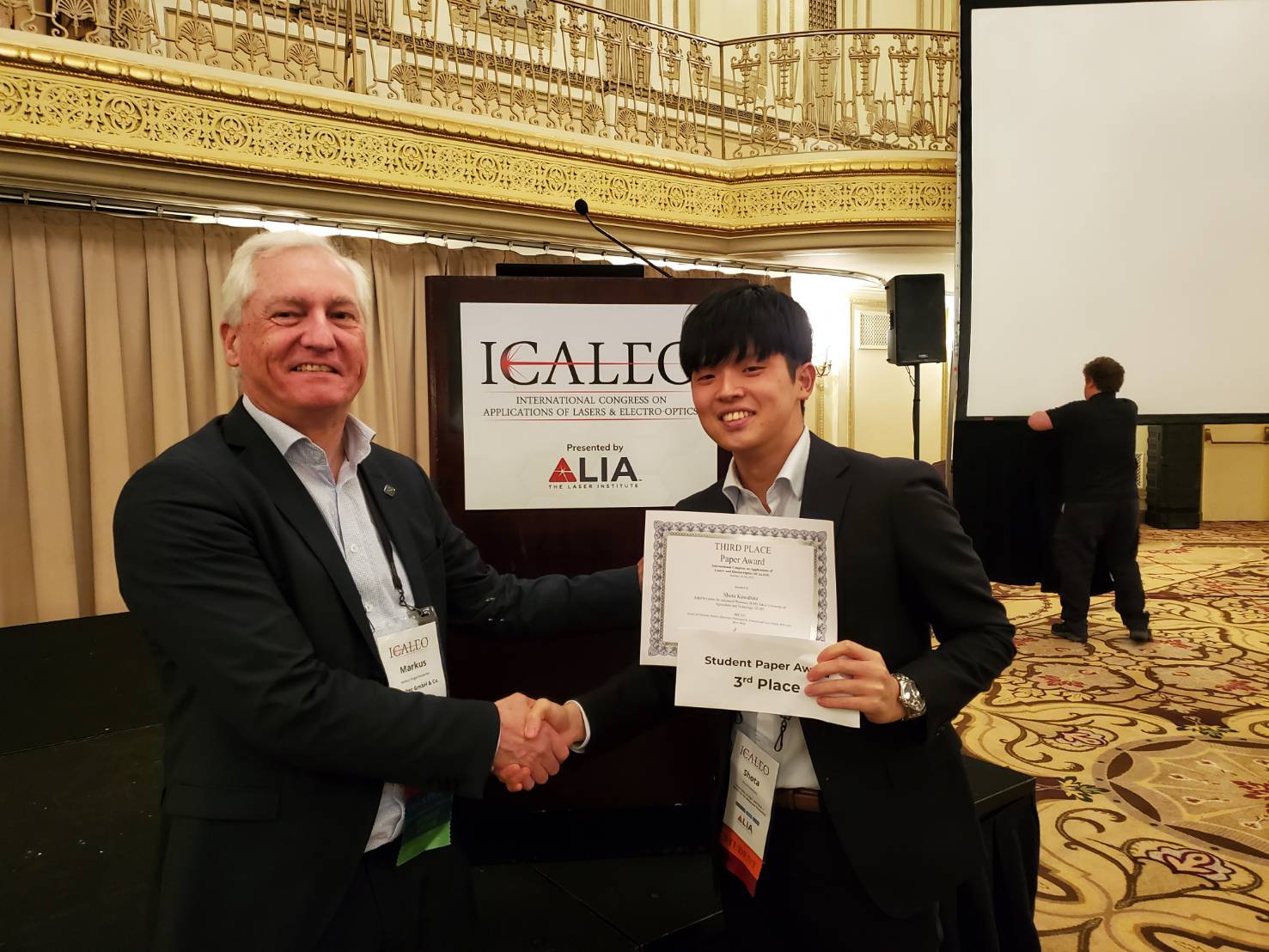 工学府物理システム工学専攻2年の川端祥太さんが International Congress on Applications of Lasers and ElectroOptics (ICALEO) 「Student Paper Award (3rd Place)」を受賞