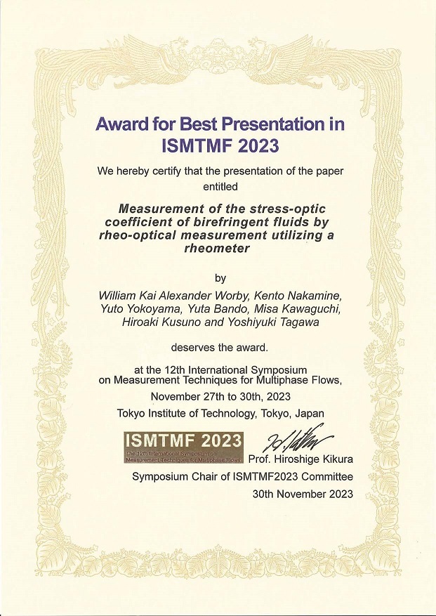 工学府産業技術専攻2年のウォービーウィリアム海アレクサンダーさんが、2023年11月30日にThe 12th International Symposium on Measurement of Techniques for Multiphase Flows「Award of Best Presentation」を受賞しました。