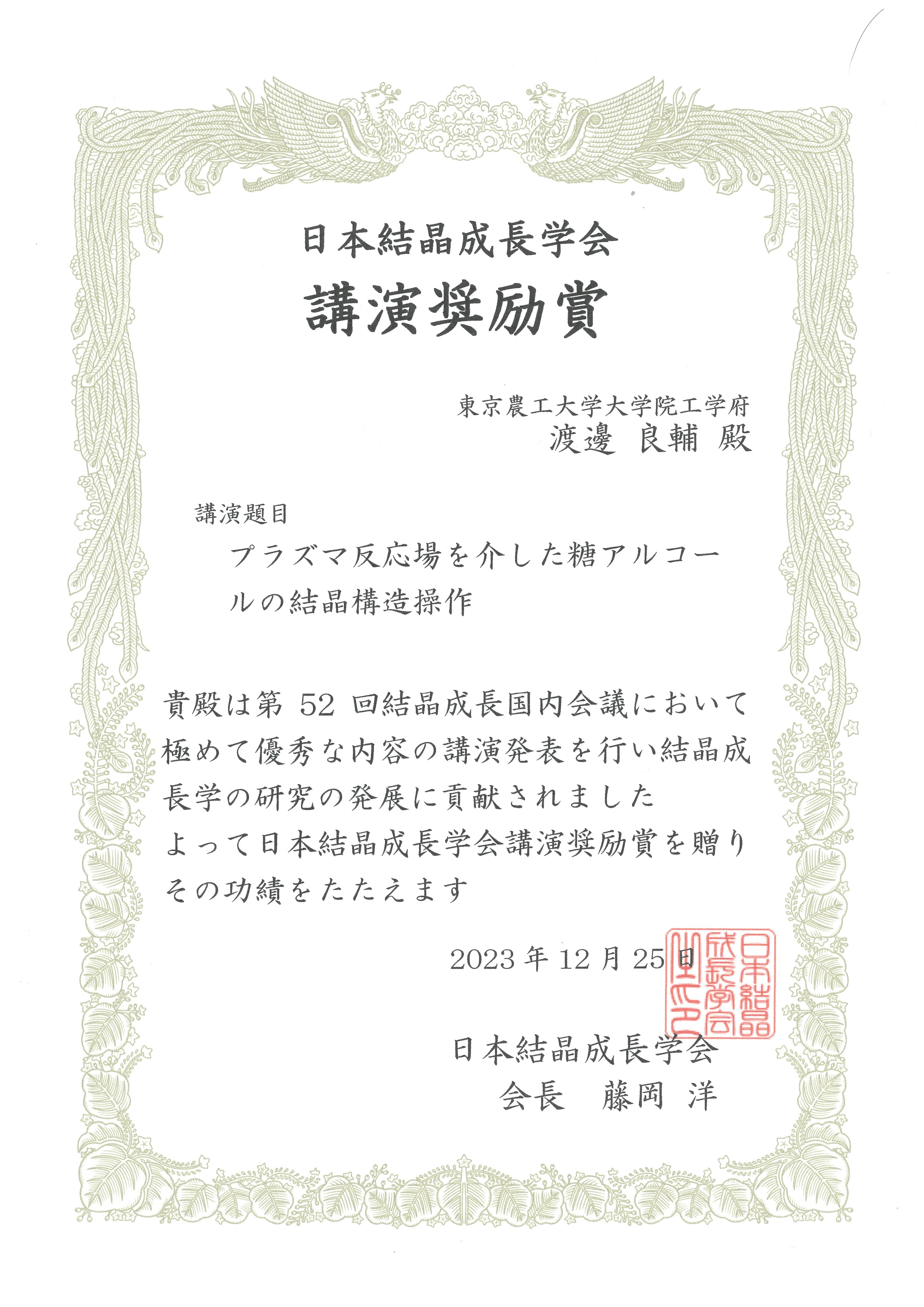 工学府生体医用システム工学専攻1年の渡邊良輔さんが、2023年12月25日に第52回結晶成長国内会議(JCCG-52)「日本結晶成長学会 講演奨励賞」を受賞しました。