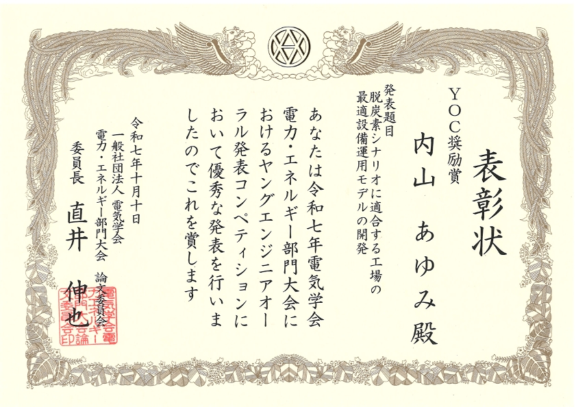 生物システム応用科学府生物機能システム科学専攻2年の内山あゆみさんが、2025年10月10日に2025年電気学会電力・エネルギー部門大会「Young engineer Oral presentation Competition(YOC)奨励賞」を受賞しました。