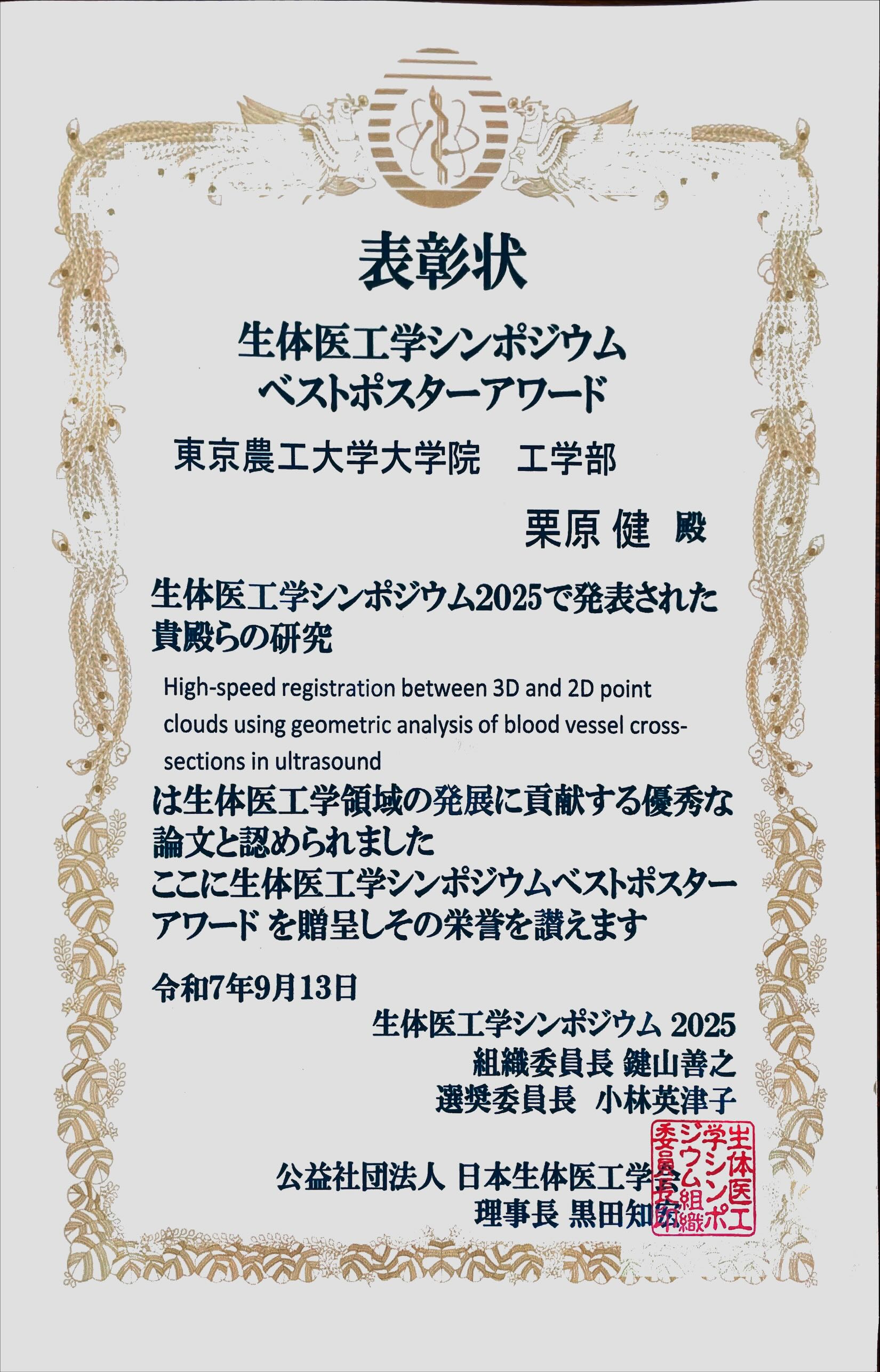 工学府生体医用システム工学専攻2年の栗原健さんが、2025年9月13日に生体医工学シンポジウム2025「ベストポスターアワード」を受賞しました。