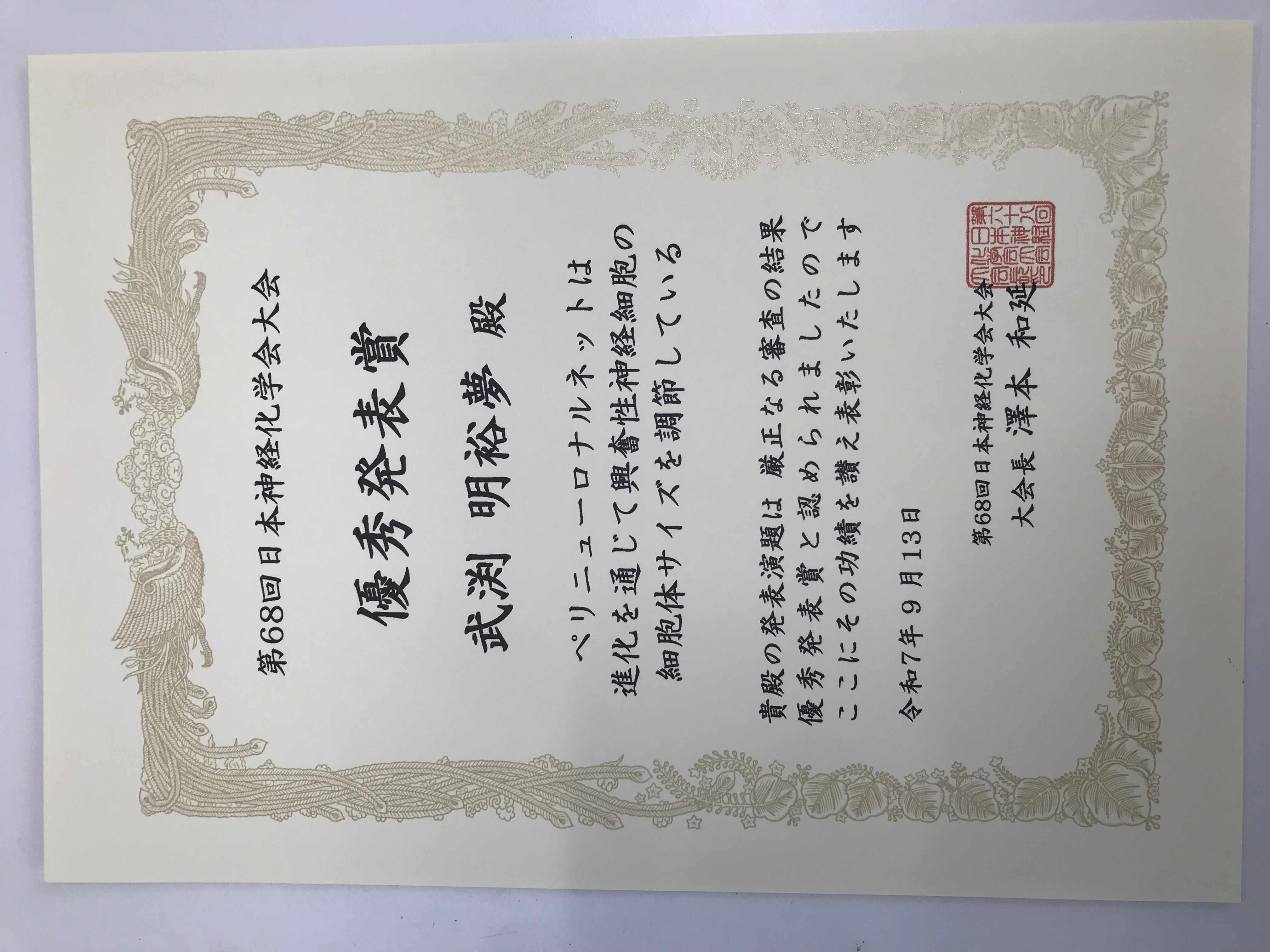 連合農学研究科応用生命科学専攻3年の武渕明裕夢さんが、2025年9月13日に第68回日本神経化学会大会「優秀発表賞」を受賞しました。