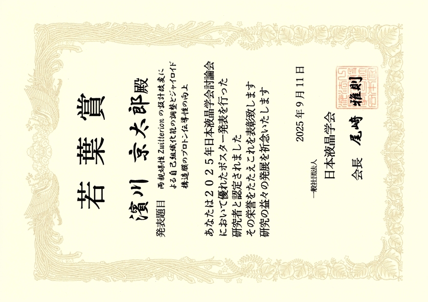 工学府生命工学専攻2年の濱川京太郎さんが、2025年9月11日に日本液晶学会討論会「若葉賞」を受賞しました。