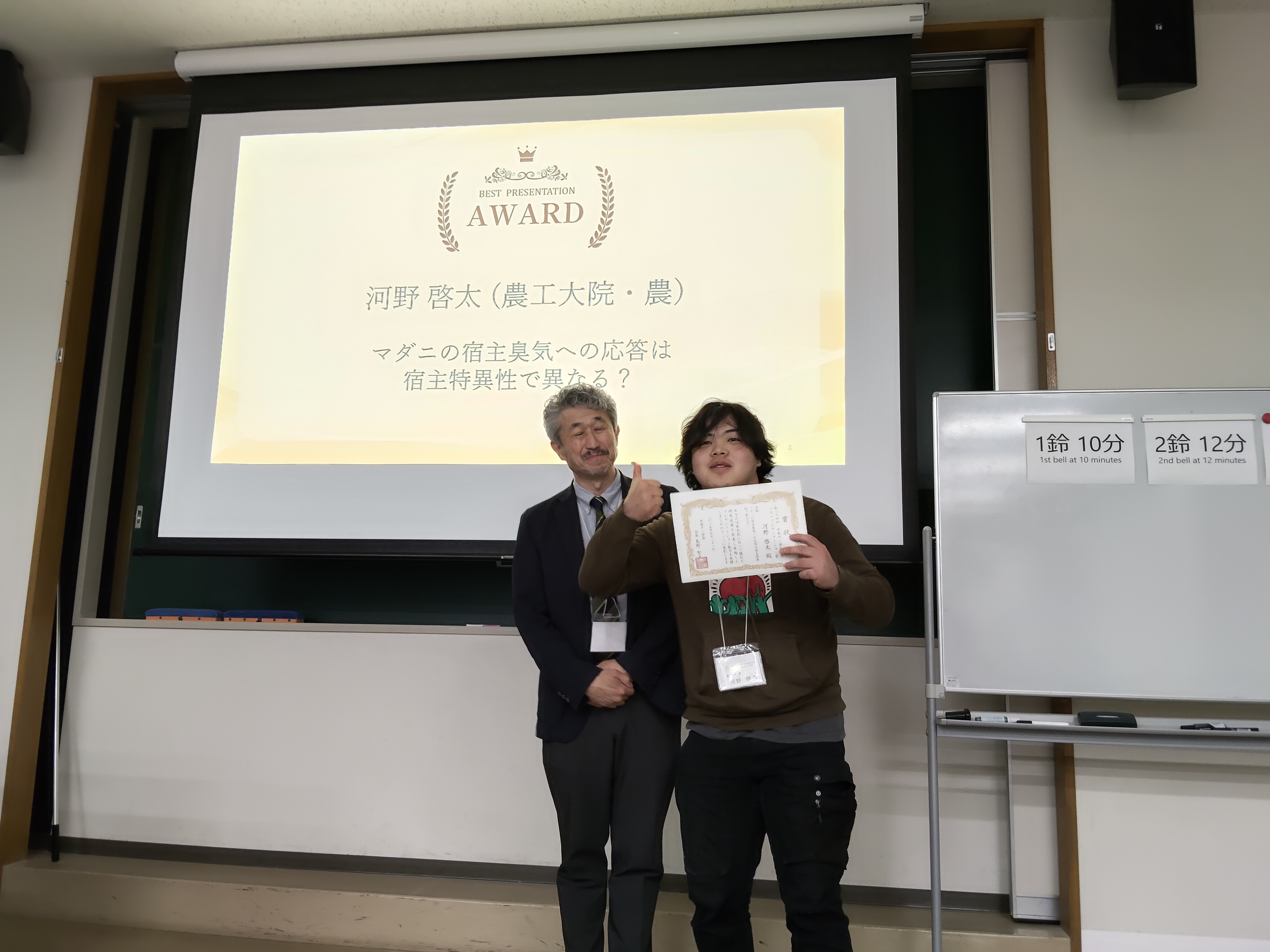 農学府農学専攻2年の河野啓太さんが第34回日本ダニ学会大会「ベストプレゼンテーション賞」を受賞