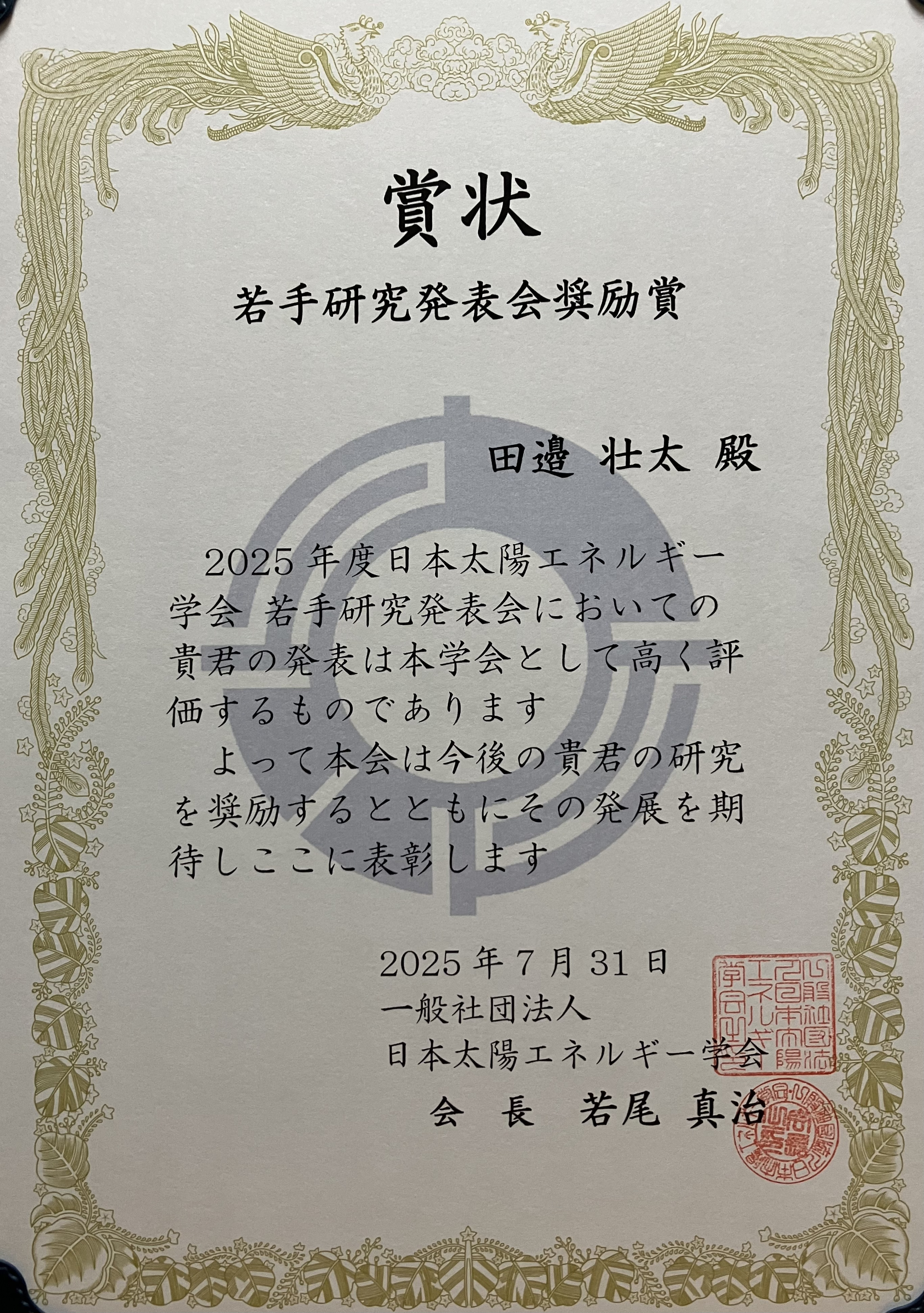 先進学際科学府先進学際科学専攻1年の田邉壮太さんが、2025年7月31日に日本太陽エネルギー学会「若手研究発表会奨励賞」を受賞しました。