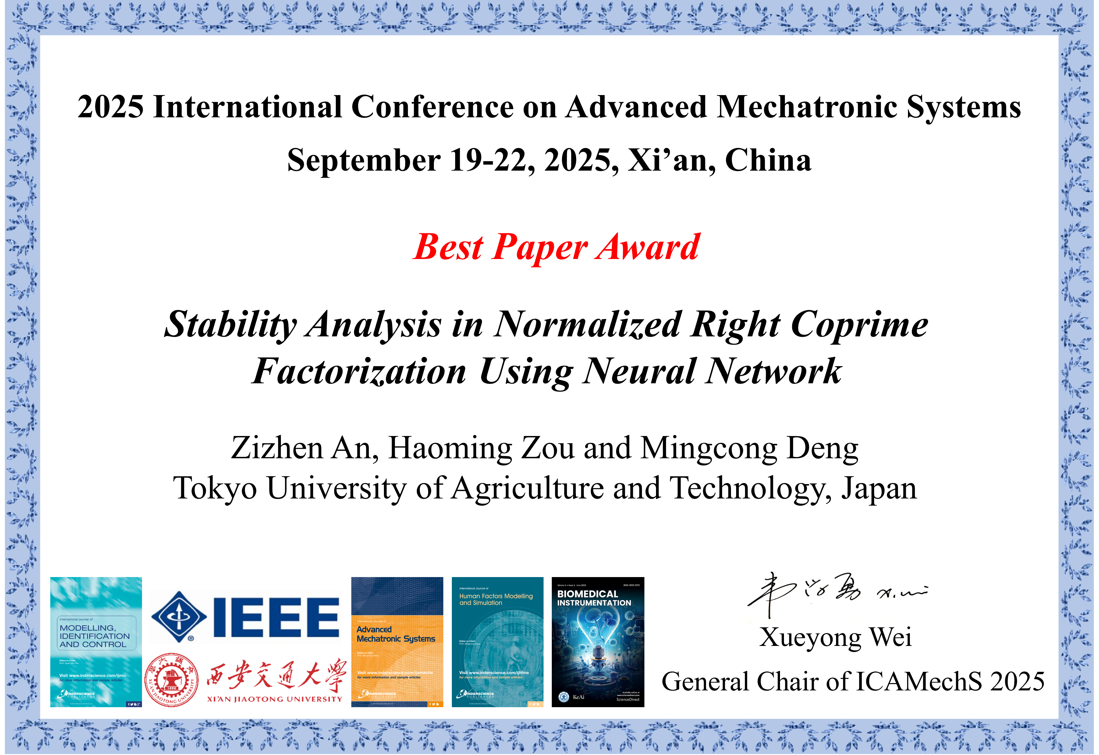 工学府知能情報システム工学専攻1年のAn Zizhenさんが、2025年9月21日に2025 International Conference on Advanced Mechatronic Systems (2025 ICAMechS)「Best Paper Award」を受賞しました。