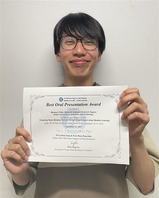 工学府機械システム工学専攻1年の内藤正教さんが、2025年9月12日にThe 18th Asian Congress of Fluid Mechanics「Best Oral Presentation Award」を受賞しました。