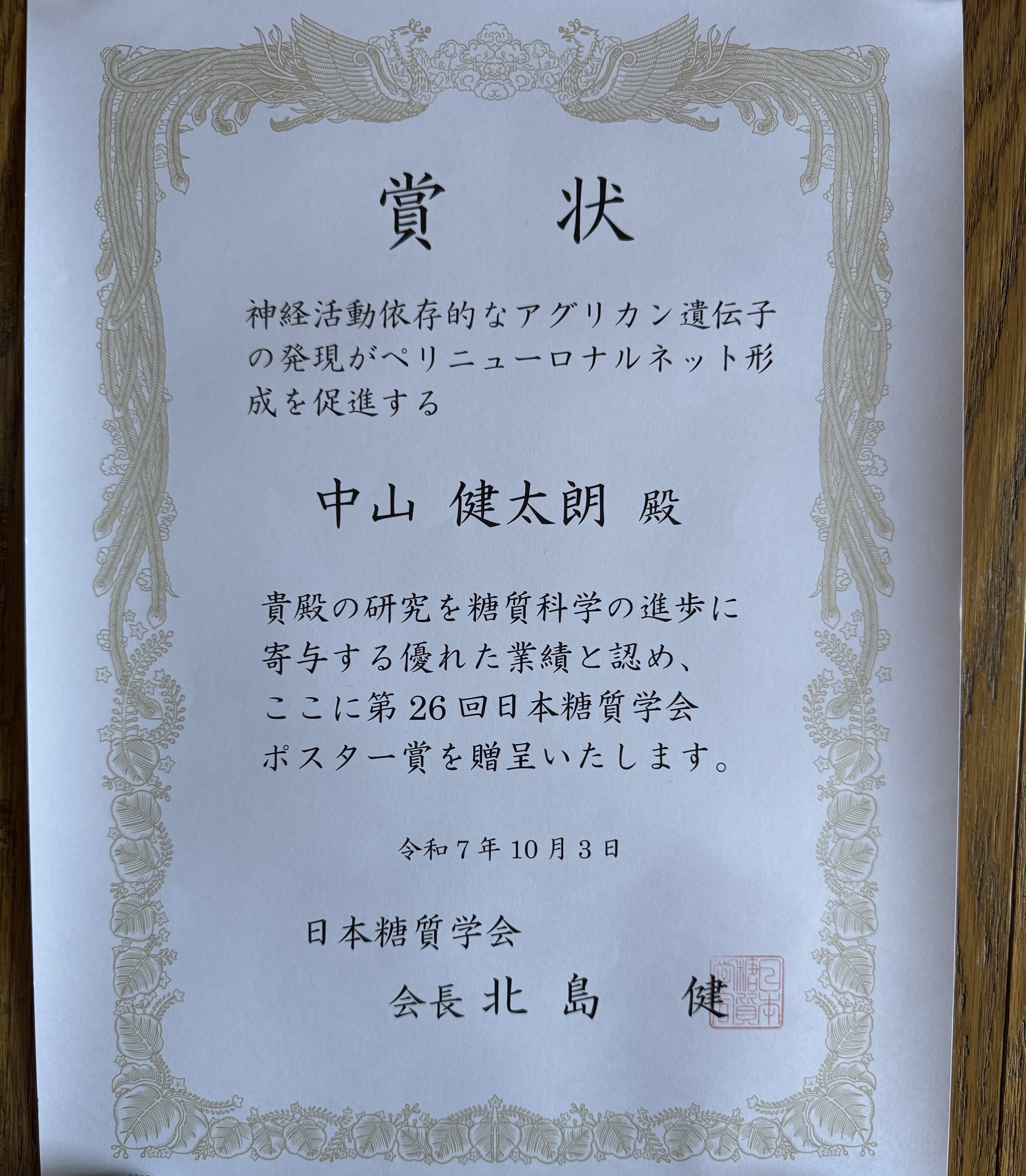 農学府農学専攻2年の中山健太朗さんが、2025年10月3日に第43回日本糖質学会年会「第26回日本糖質学会ポスター賞」を受賞しました。