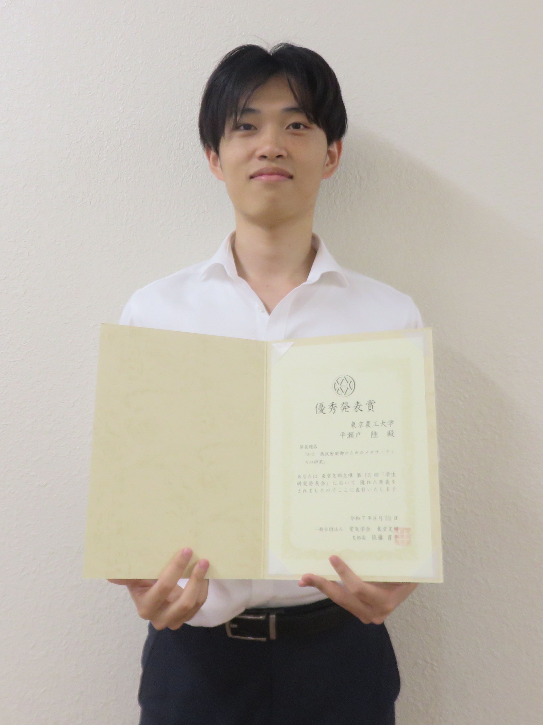 工学部知能情報システム工学科4年の平瀬戸陸さんが、2025年8月22日に電気学会東京支部 第15回学生研究発表会「優秀発表賞」を受賞しました。