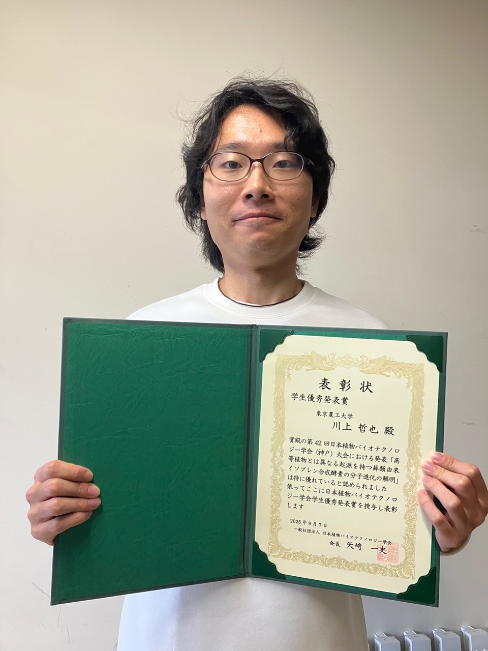 連合農学研究科生物生産科学専攻2年の川上哲也さんが、2025年9月7日に第42回日本植物バイオテクノロジー学会大会「学生優秀発表賞」を受賞しました。