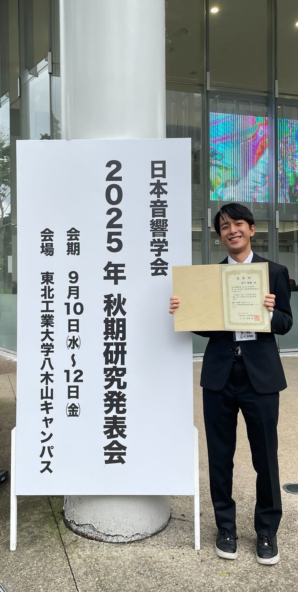 工学府知能情報システム工学専攻1年の皆川朋樹さんが、2025年9月11日に日本音響学会「第30回学生優秀発表賞」を受賞しました。