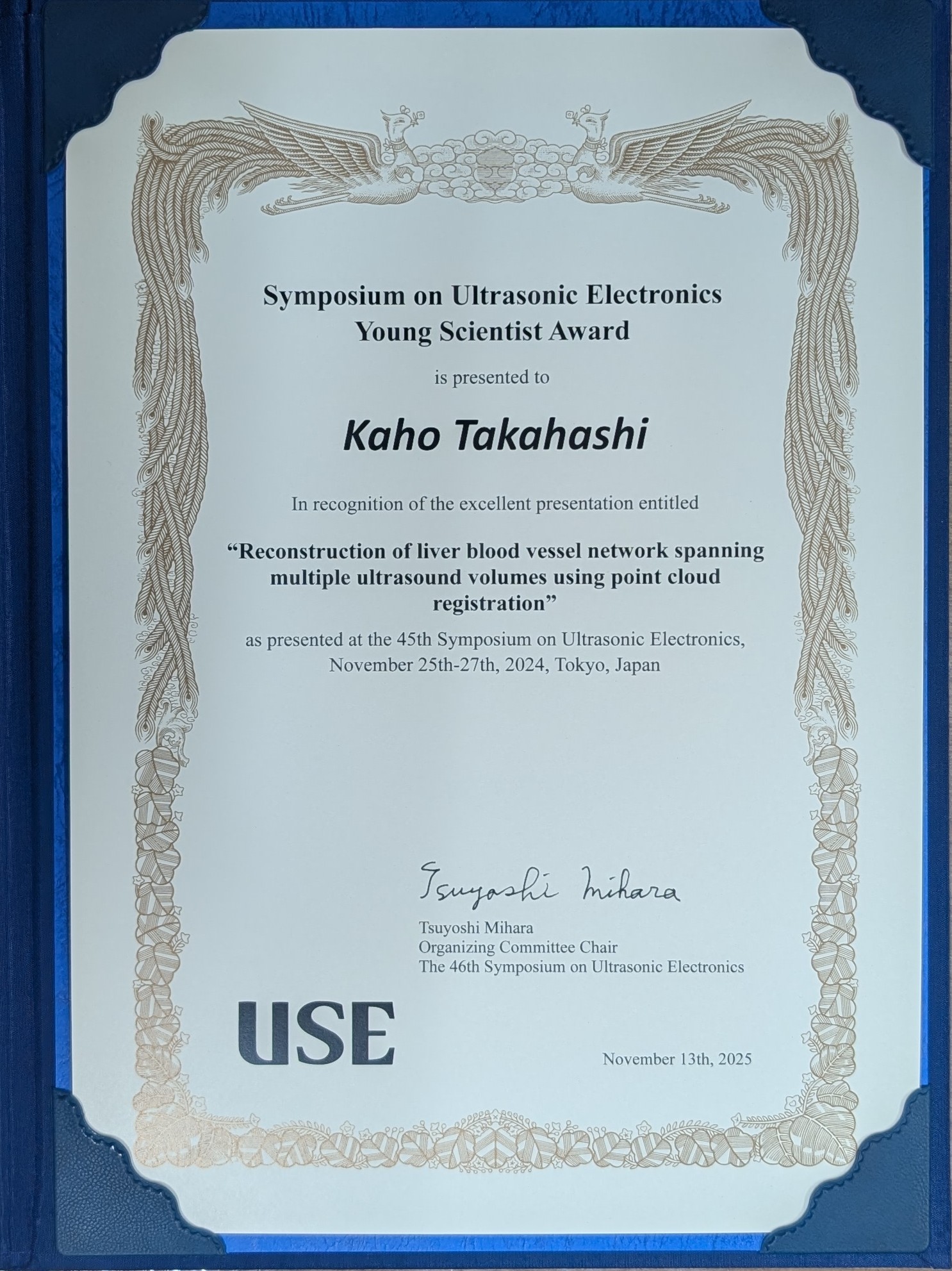 工学府産業技術専攻2年の髙橋果歩さんが、2025年11月13日にSymposium on Ultrasonic Electronics 「Young Scientist Award(奨励賞)」を受賞しました。
