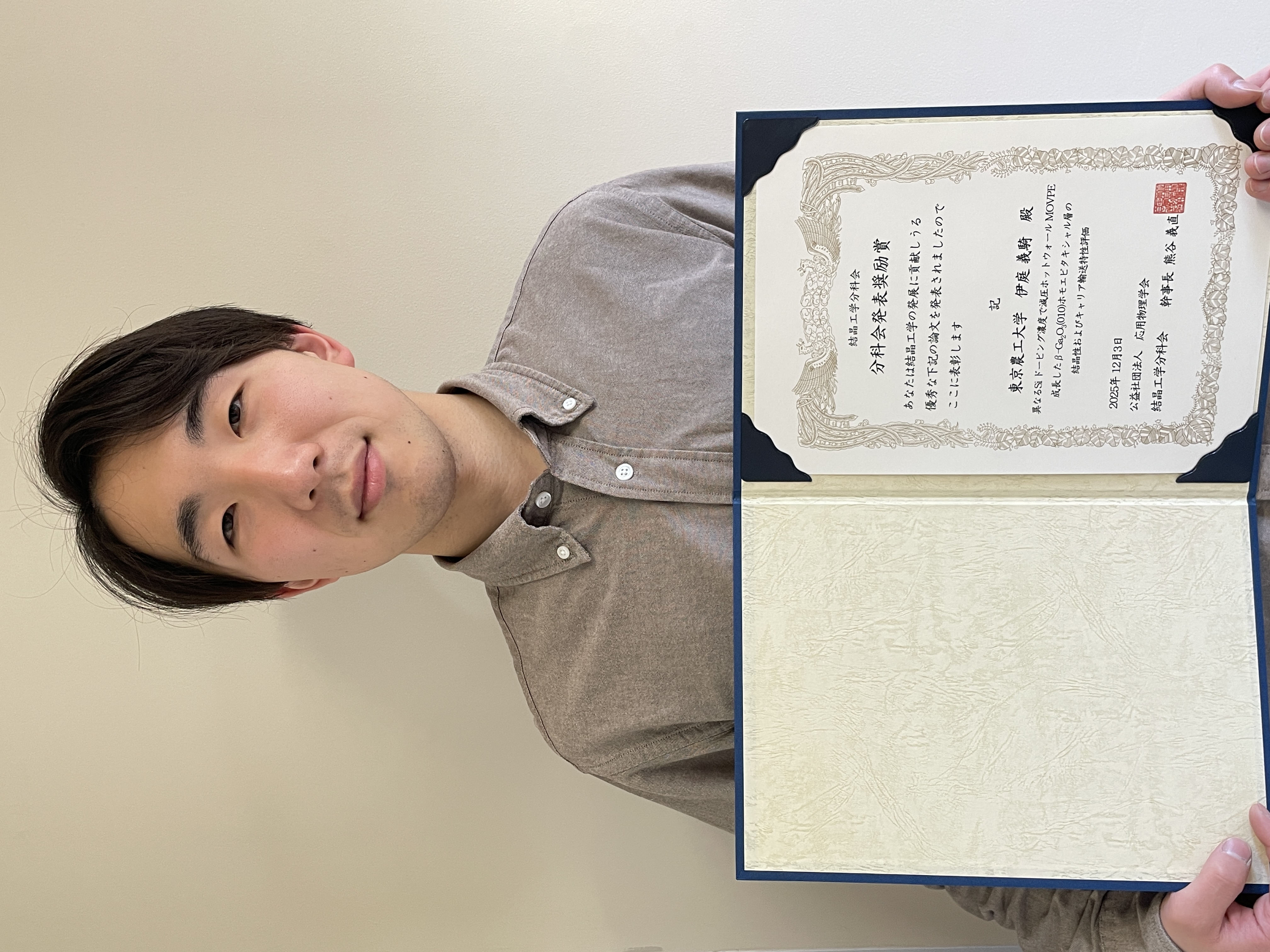 工学府応用化学専攻1年の伊庭義騎さんが、2025年12月3日に応用物理学会結晶工学分科会主催第4回結晶工学講演会「結晶工学分科会発表奨励賞」を受賞しました。