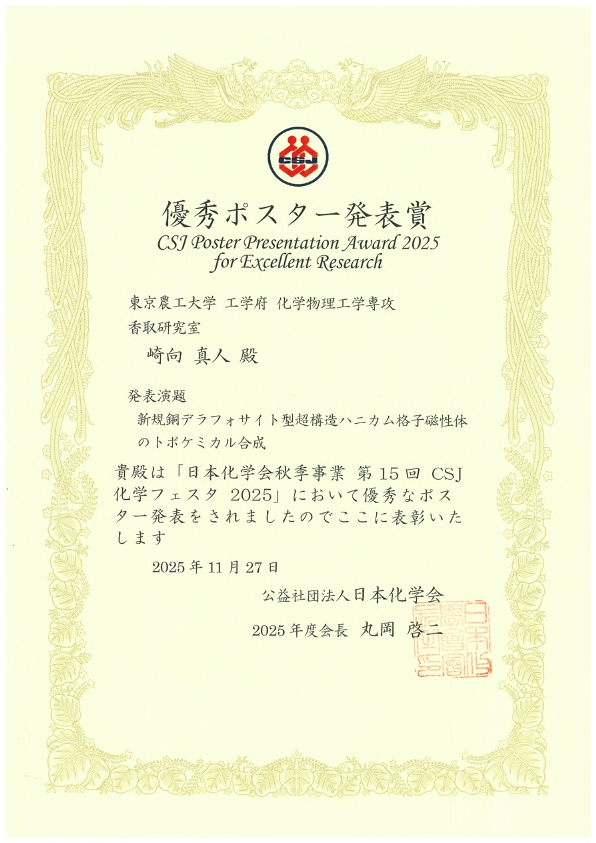 工学府化学物理工学専攻1年の崎向真人さんが、2025年11月27日に日本化学会秋季事業第25回CSJ化学フェスタ2025「優秀ポスター発表賞」を受賞しました。