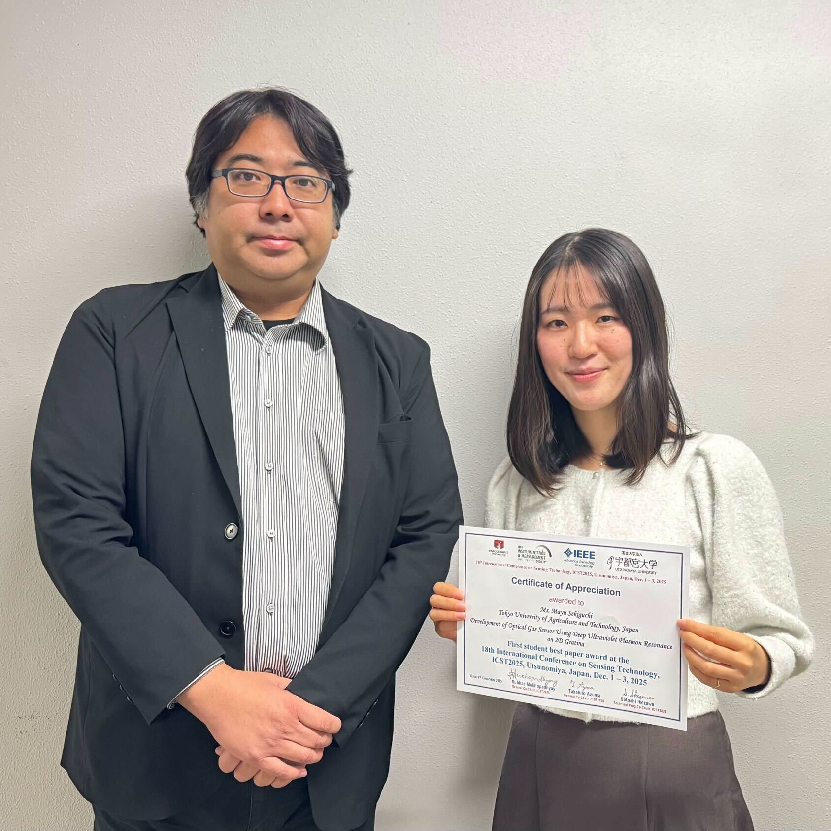生物システム応用科学府生物機能システム科学専攻2年の関口真由さんが、2025年12月3日にThe 18th IEEE International Conference on Sensing Technology「Student best paper award」を受賞しました。