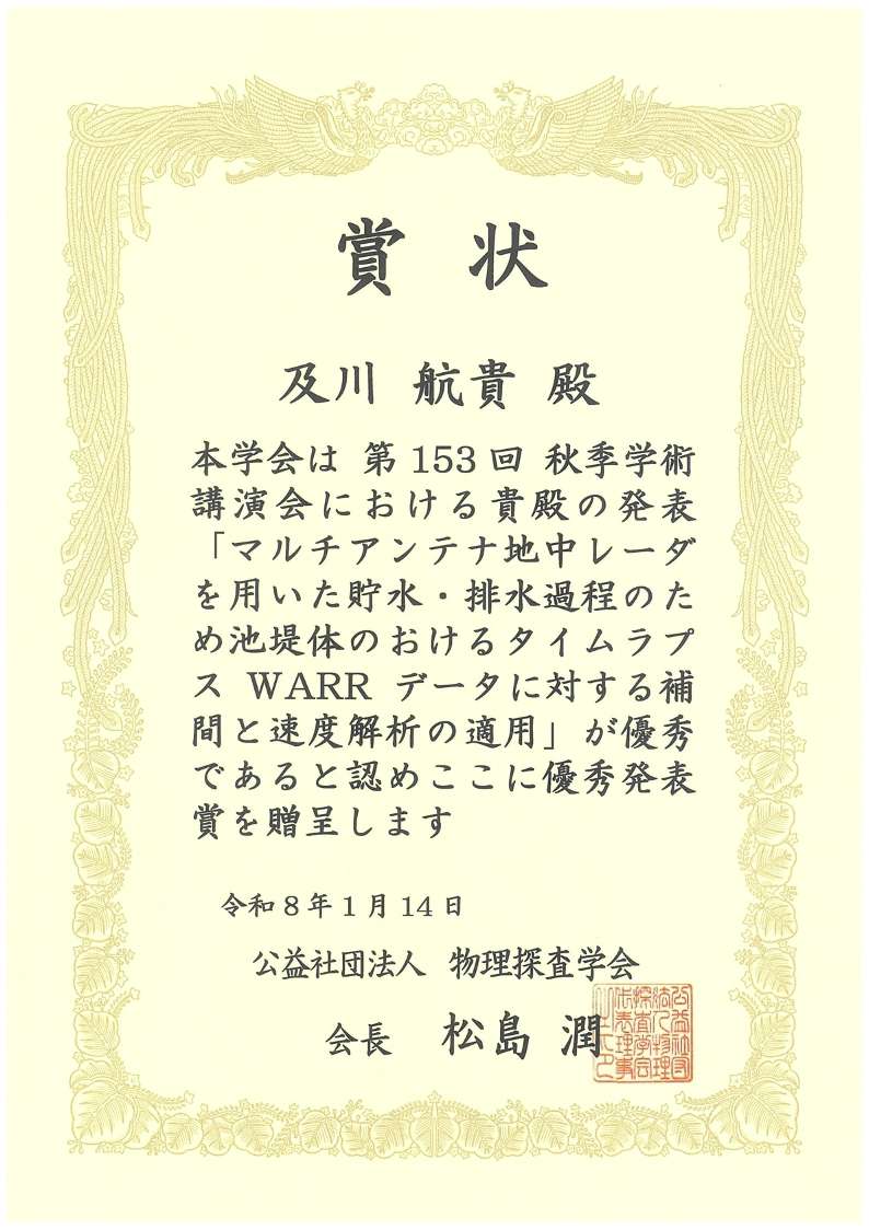 連合農学研究科農業環境工学専攻3年の及川航貴さんが、2026年1月14日に物理探査学会第153回秋季学術講演会「優秀発表賞」を受賞しました。