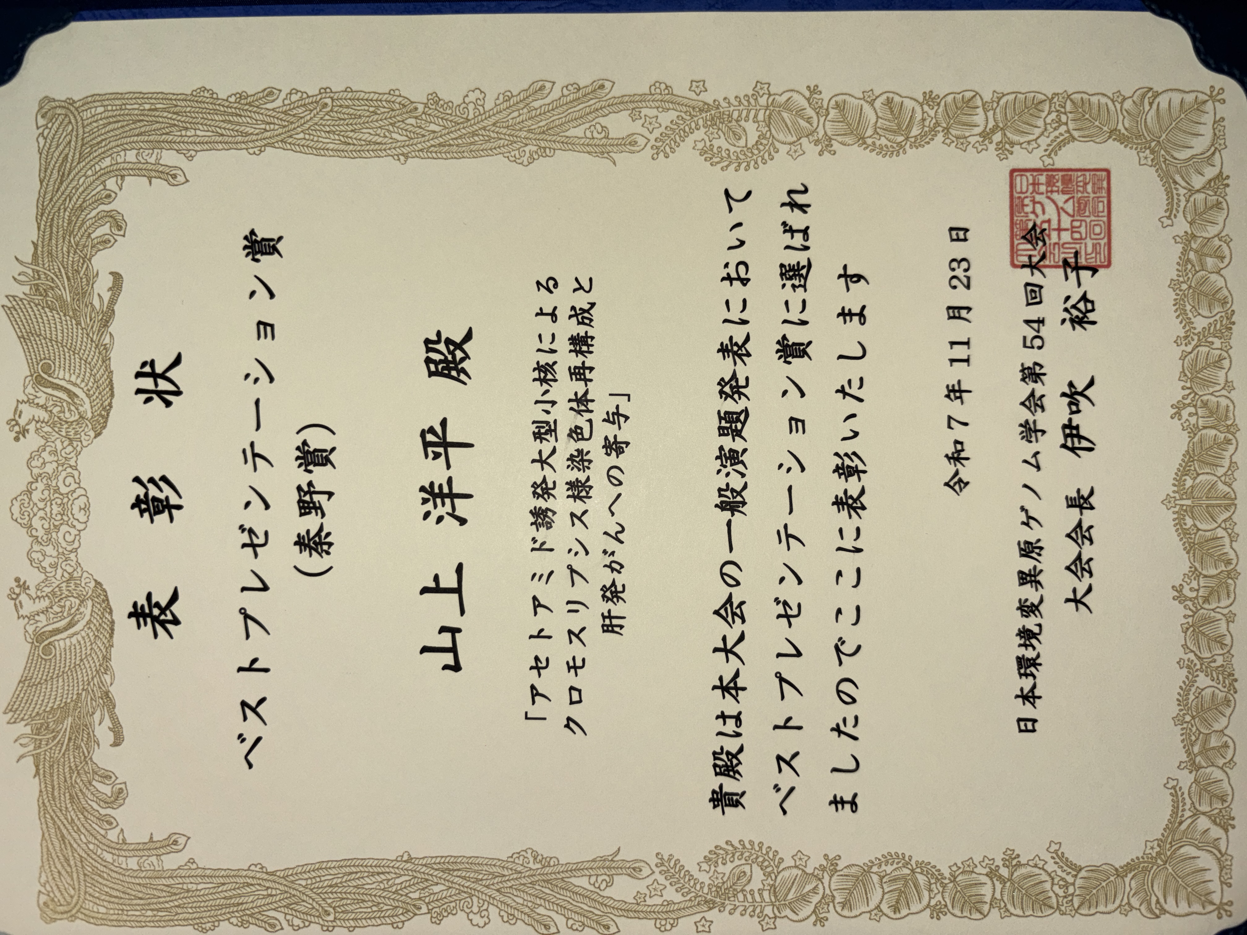 農学府 共同獣医学専攻3年の山上洋平さんが、2025年11月23日に第54回日本環境変異原ゲノム学会「ベストプレゼンテーション賞」を受賞しました。
