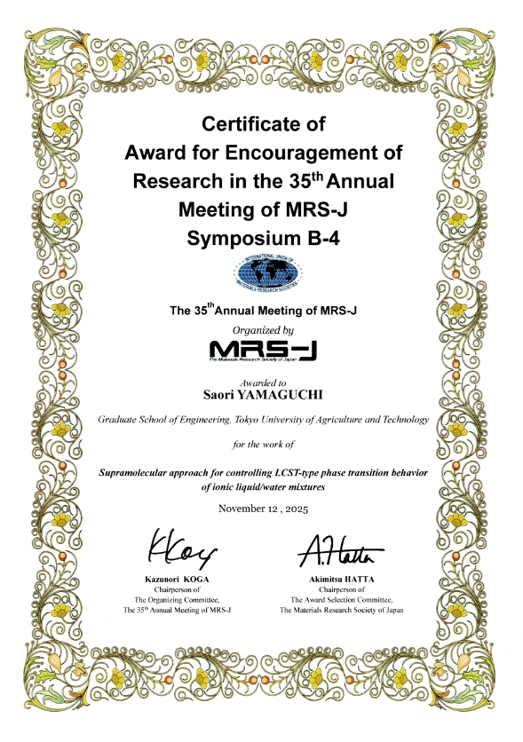 工学府生命工学専攻2年の山口沙緒里さんが、2025年11月12日に第35回日本MRS年次大会「奨励賞」を受賞しました。