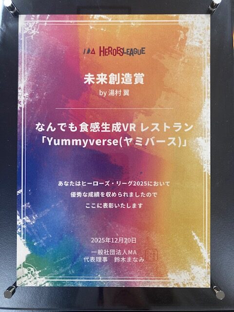 「電脳レストラン」は、これまで複数のコンテストに参加し、チームが開発したAIを用いて食品の感覚を再現するVR食体験システム「Yummyverse(ヤミバース)」での受賞実績を重ねてきました。ヒーローズ・リーグ2025のオンライン決勝戦でもその取り組みが高く評価され、未来創造賞を受賞しました。