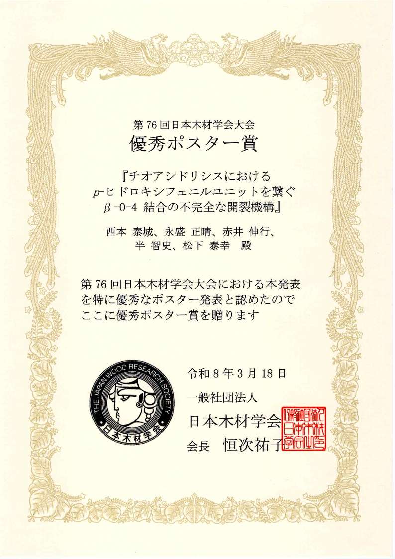 連合農学研究科環境資源共生科学専攻1年の西本泰城さんが、2026年3月18日に第76回日本木材学会大会「優秀ポスター賞」を受賞しました。