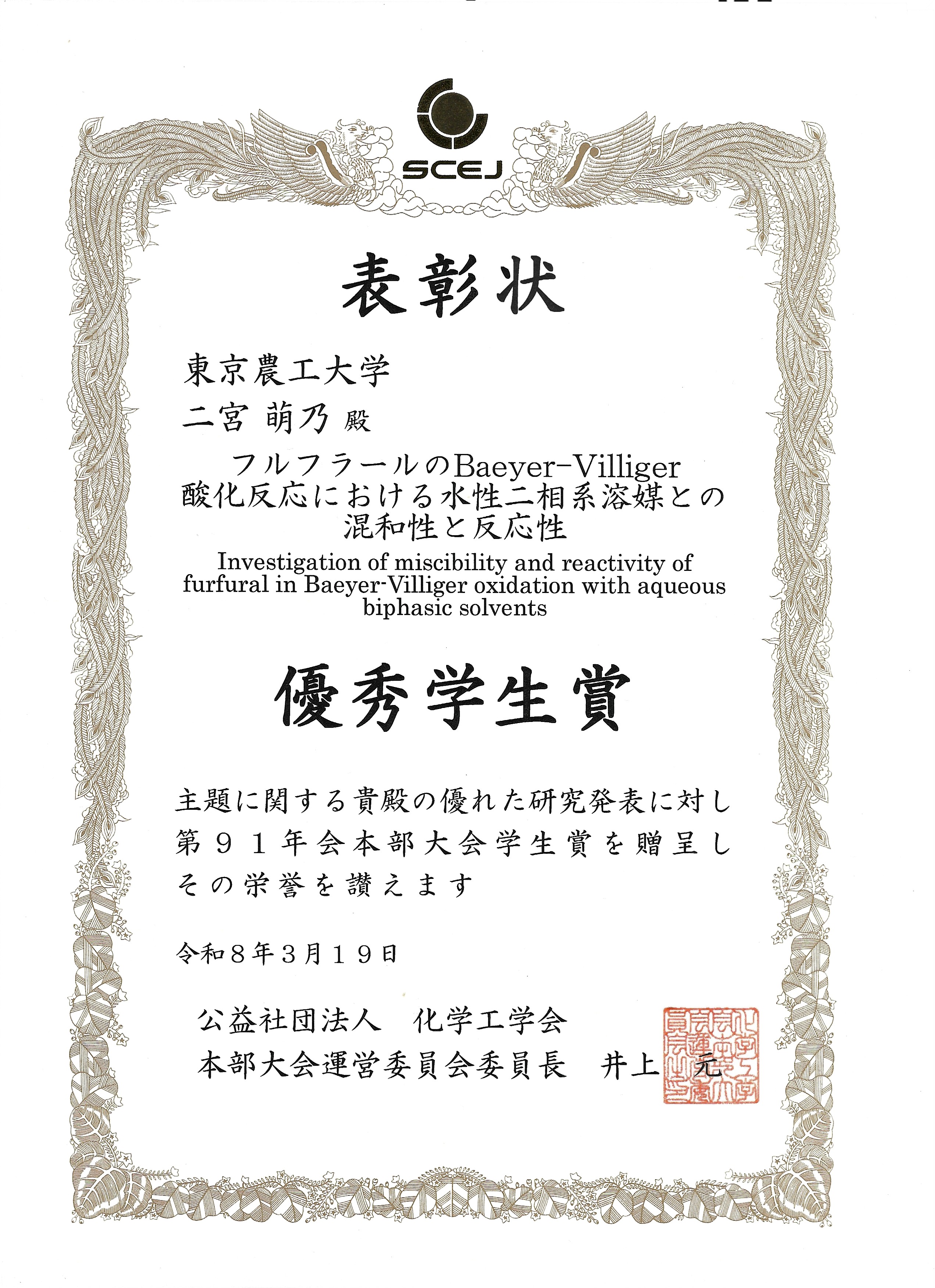 工学部化学物理工学科4年の二宮萌乃さんが、2026年3月19日に化学工学会第91年会「優秀学生賞」を受賞しました。