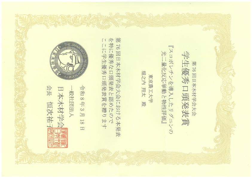 生物システム応用科学府生物機能システム科学専攻2年の堀之内翔太さんが、2026年3月18日に第76回日本木材学会大会「学生優秀口頭発表賞」を受賞しました。