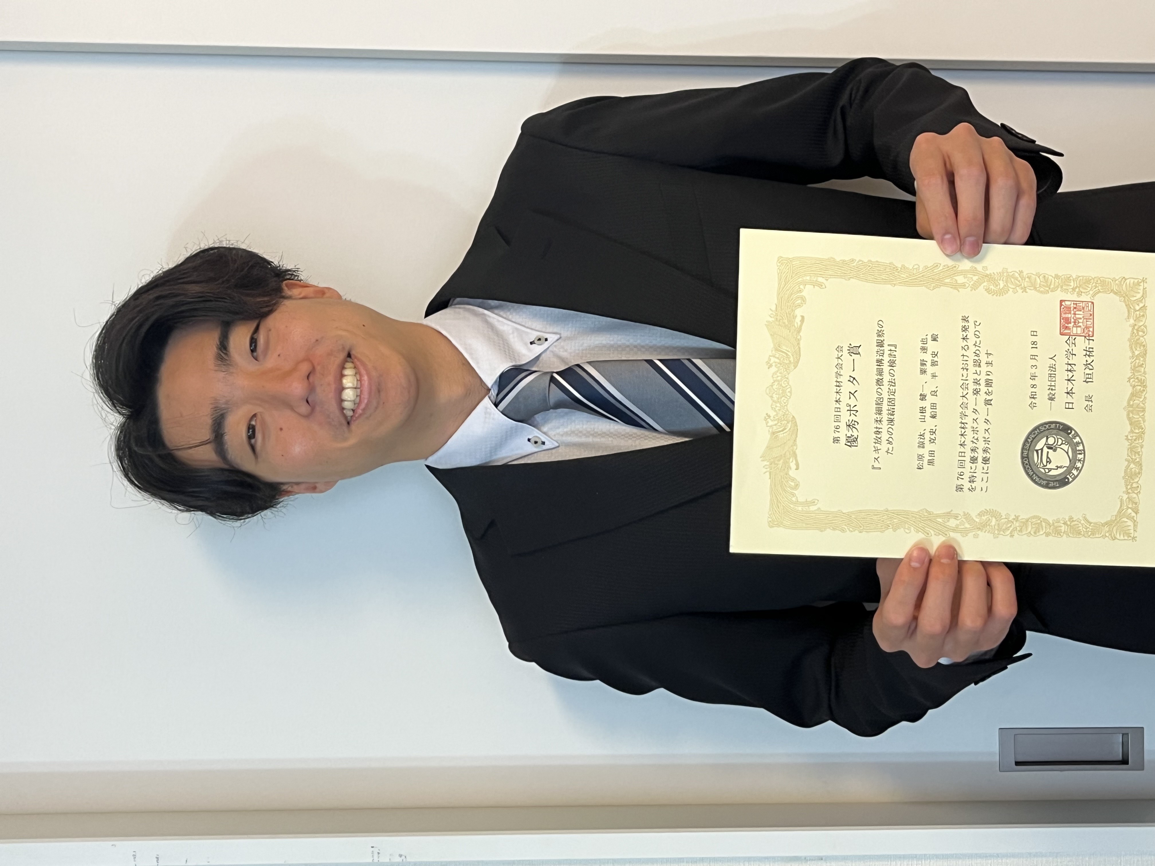 農学府農学専攻2年の松原諒汰さんが、2026年3月18日に第76回日本木材学会大会(広島)「優秀ポスター賞」を受賞しました。