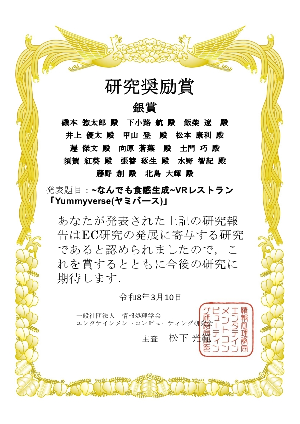 知能情報システム工学科4年の磯本惣太郎さんが、2026年3月27日に情報処理学会EC研究会第79回研究発表会「研究奨励賞 銀賞」を受賞しました。