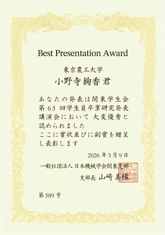 工学府機械システム工学専攻博士前期課程1年の小野寺絢香さんが、2026年3月9日に関東学生会第65回学生員卒業研究発表講演会「Best Presentation Award(学生優秀発表賞)」を受賞しました。