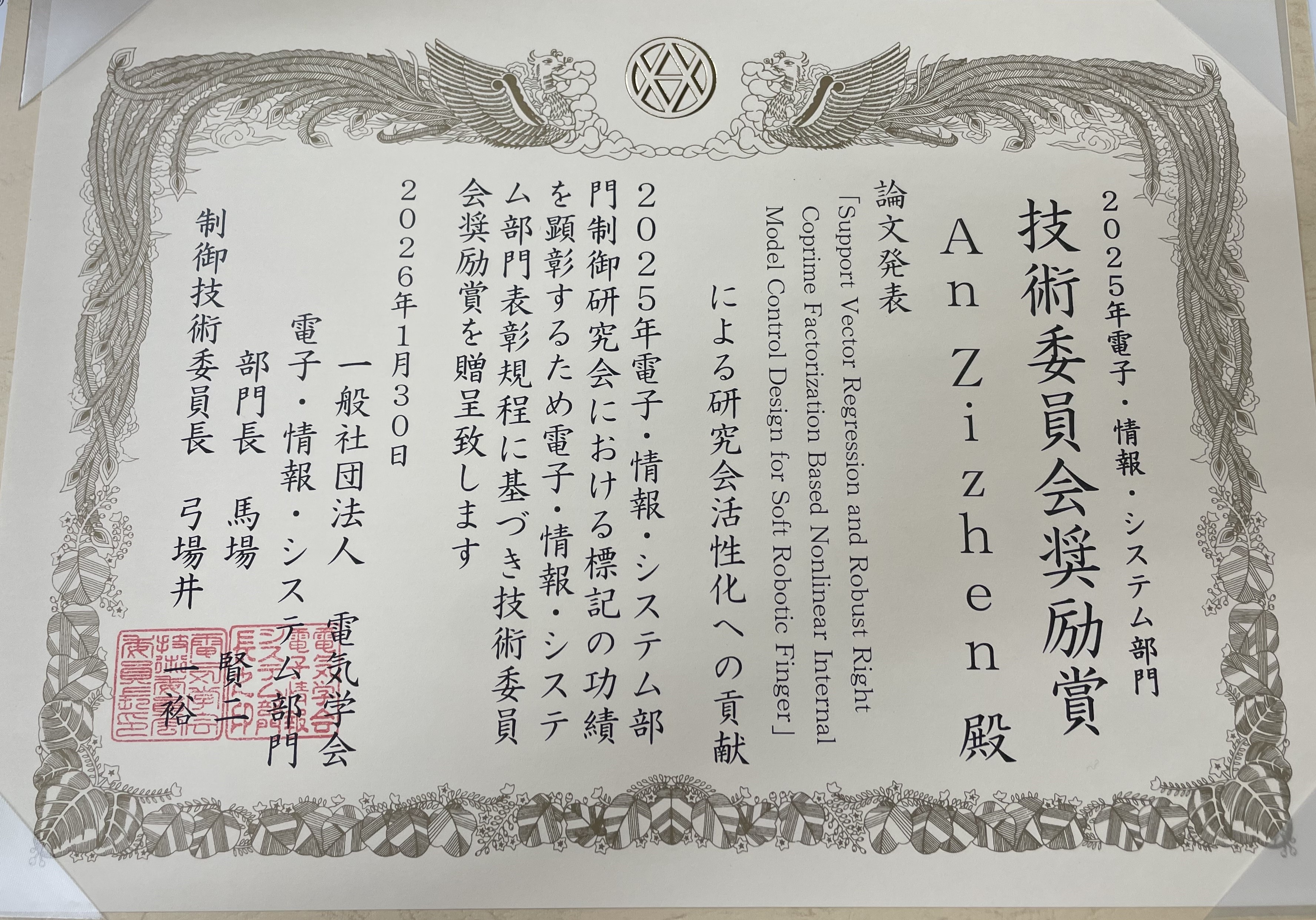 工学府知能情報システム工学専攻博士後期課程1年のAN ZIZHENさんが、2026年1月30日に2025年電子・情報・システム部門制御研究会「技術委員会奨励賞」を受賞しました。