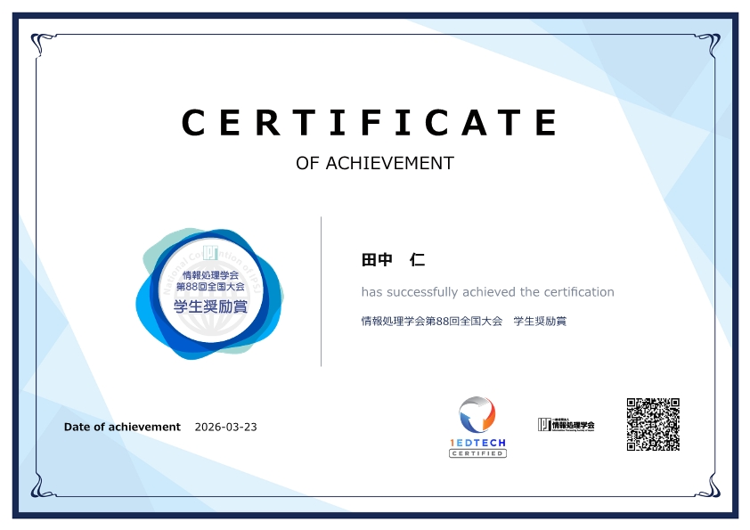 工学部知能情報システム工学科卒業生の田中仁さんが、2026年3月6日に情報処理学会第88回全国大会「学生奨励賞」を受賞しました。