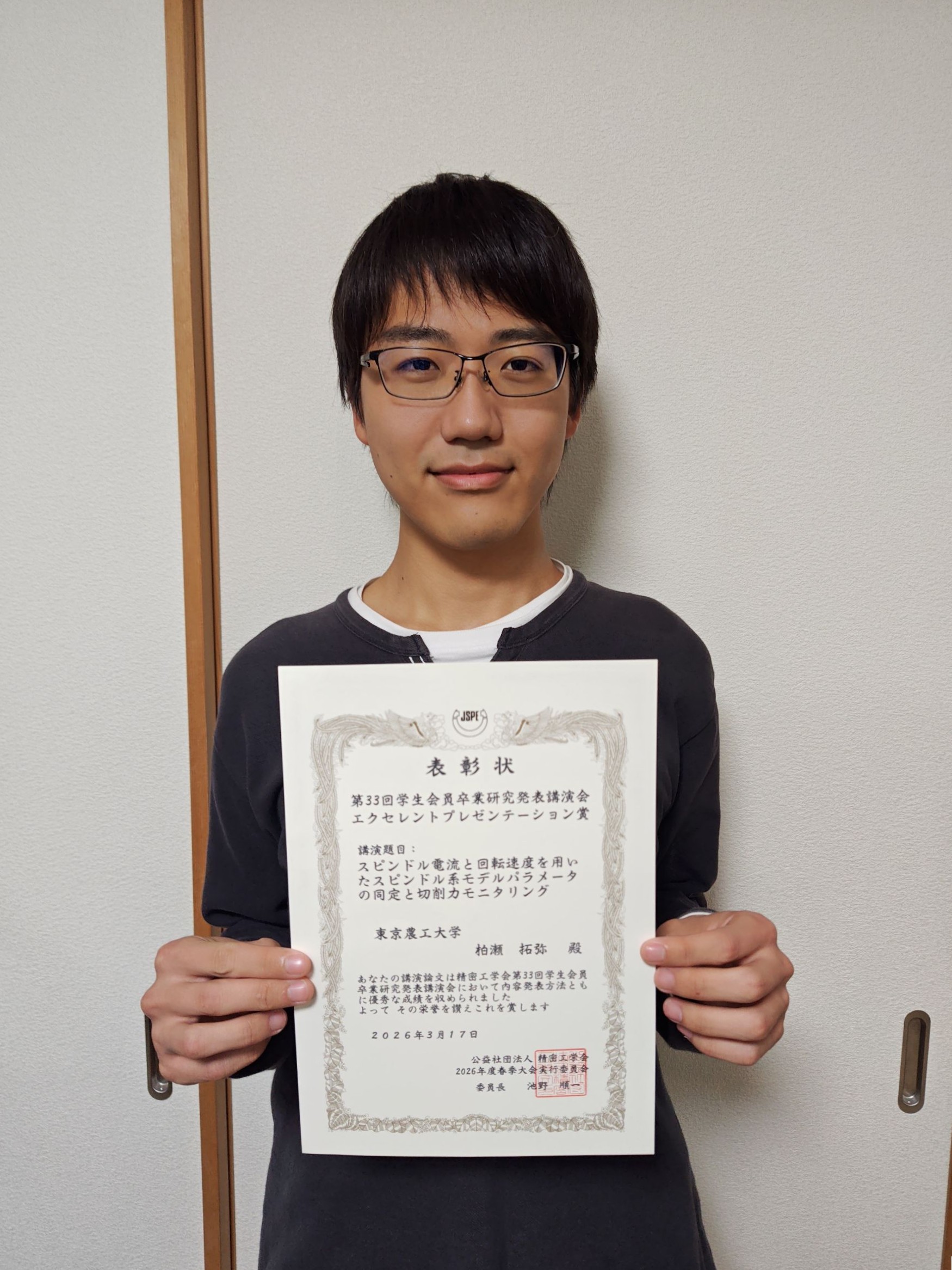 工学府機械システム工学専攻博士前期課程1年の柏瀬拓弥さんが、2026年3月17日に精密工学会春季大会第33回学生会員卒業研究発表講演会「エクセレントプレゼンテーション賞」を受賞しました。