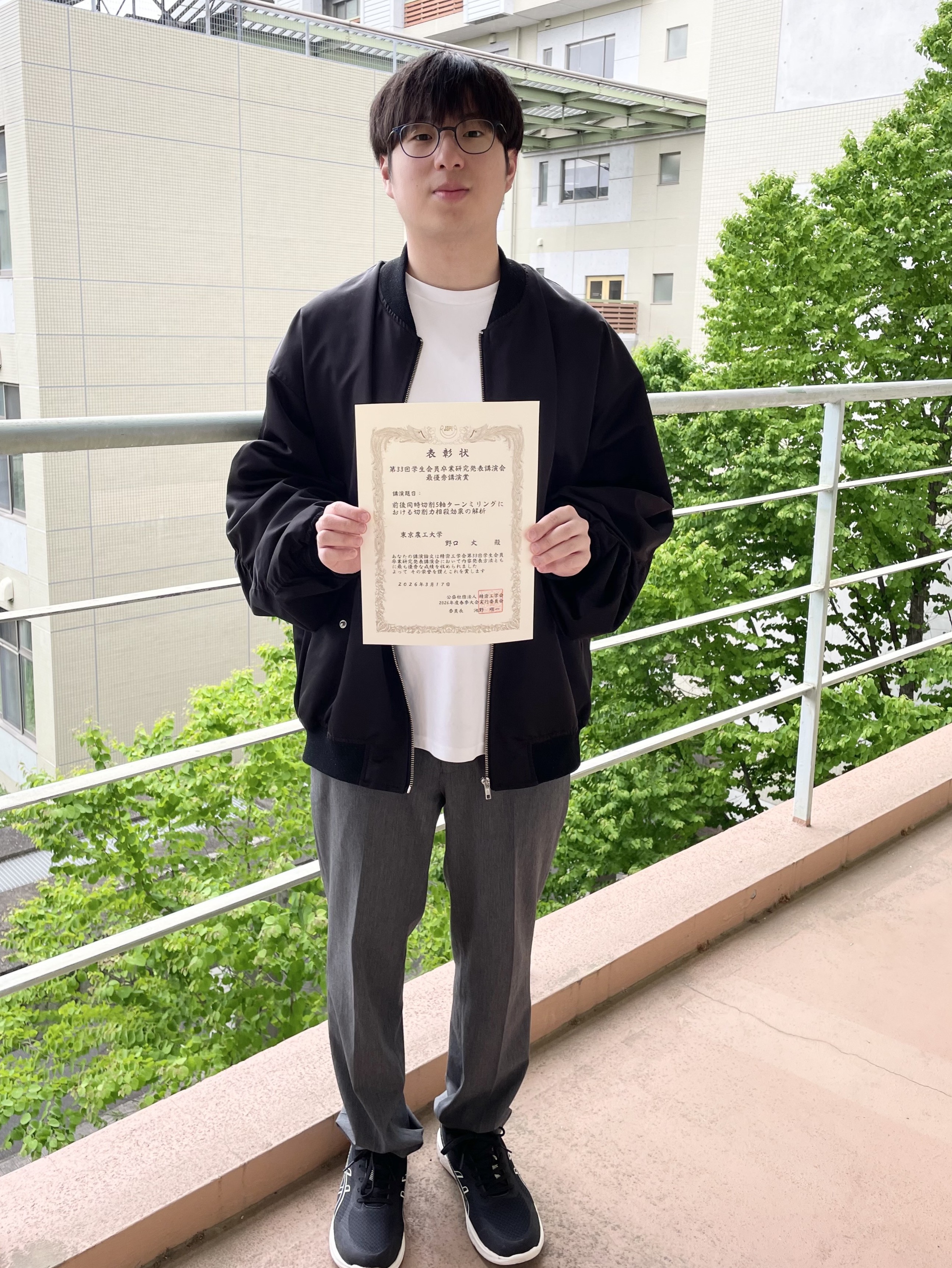 工学府機械システム工学専攻博士前期課程1年の野口丈さんが、2026年3月17日に精密工学会春季大会第33回学生会員卒業研究発表講演会「最優秀講演賞」を受賞しました。