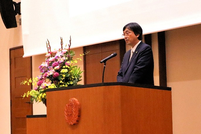 記念式典では、千葉一裕学長による開会挨拶に続き、文部科学省 合田哲雄高等教育局長の祝辞が、同省高等教育局 松本英登専門教育課長の代読により披露されました。続いて、大川泰一郎連合農学研究科長より、茨城大学、宇都宮大学、東京農工大学が連携して昭和60年4月に日本で初めて博士課程の連合大学院を設立するまでの関係者の苦労と、これまでに課程修了生、論文博士合計2060名もの博士人材を輩出してきた40年間の歩みについて報告がありました。さらに、全国の連合農学研究科を代表して、菅原卓也愛媛大学連合農学研究科長より祝辞が贈られました。