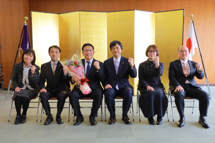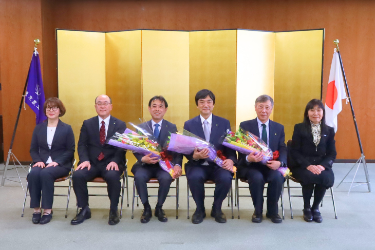 挨拶の後、職員から花束が贈呈され、最後に記念撮影を行いました。