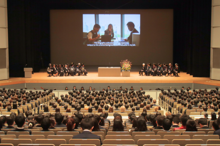 当日は、大学院生928名、学部生923名、合計1,851名の新入生を迎えました。式では、入学生代表宣誓、中村暢文学長からの入学許可及び式辞に続いて、修了生からのメッセージを映し出し、学内関係者の紹介が行われました。