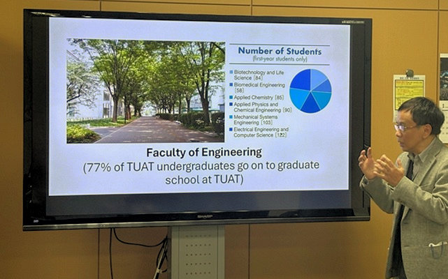 会談では、本学の動画による紹介、レンゴロ教授によるインドネシアと本学の交流についてのプレゼンテーションを行い、LPDPによる国費留学等、今後の本学との国際連携に関する検討や交流促進について活発な意見交換が行われました。2025年10月にジョグジャカルタで開催された国際会議において、本学から派遣した約50名の訪問団による研究発表に対し謝意が示されました。併せて、本学側から国際会議における農工大セッションの設置ならびに本学に対する非正規生の派遣調整への協力に対する感謝の意をお伝えしました。さらにセメスター単位の非正規生の受け入れと派遣も含め、今後の学生交流の一層の推進に向けた協力体制について建設的な議論が行われました。