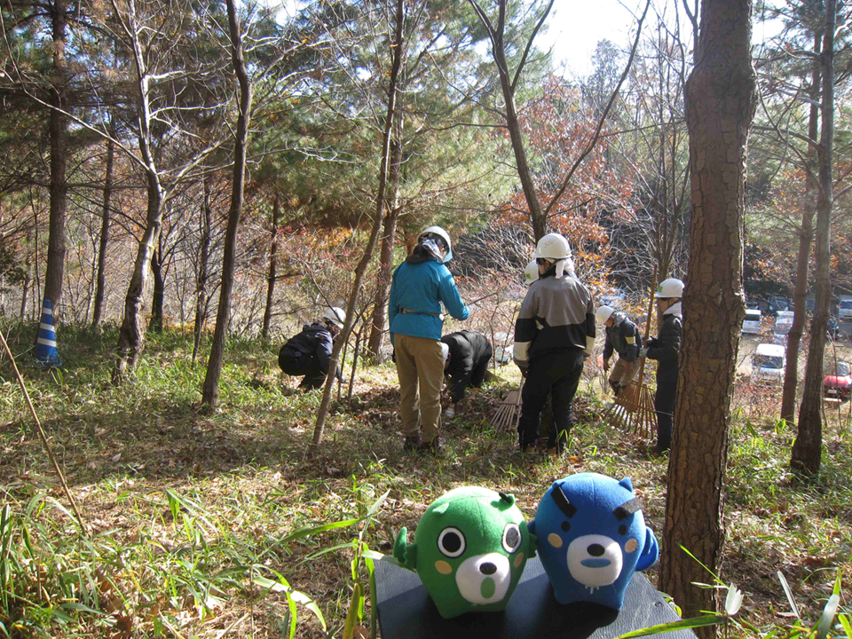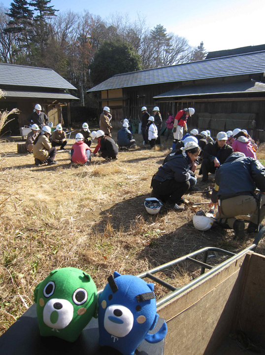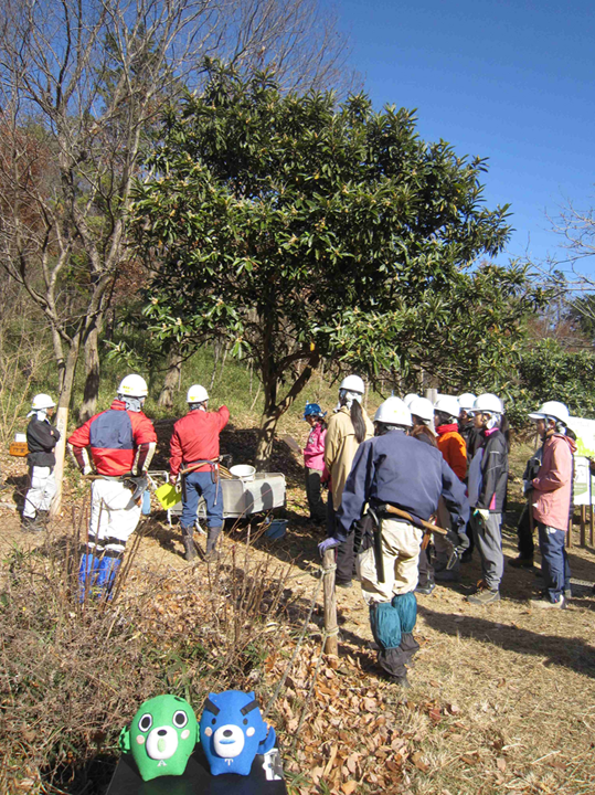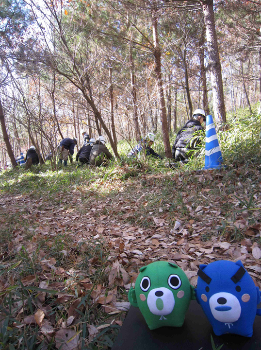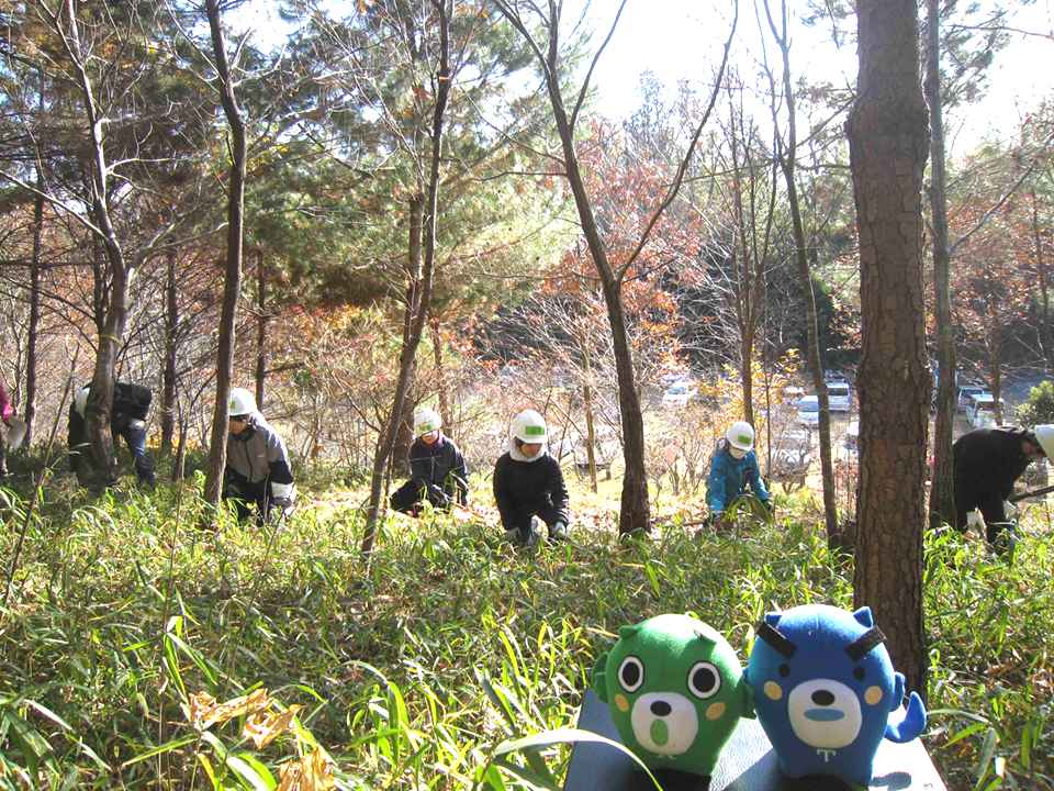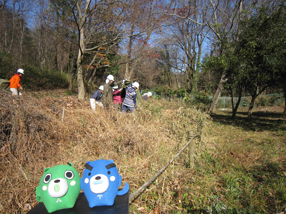公園ボランティアの方たちの指導のもと、里山の下刈りを行うワン。