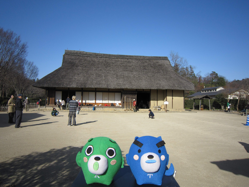 集合場所の里山民家は公園の中心的な場所で、とても立派な茅葺(かやぶき)屋根なんだワン。