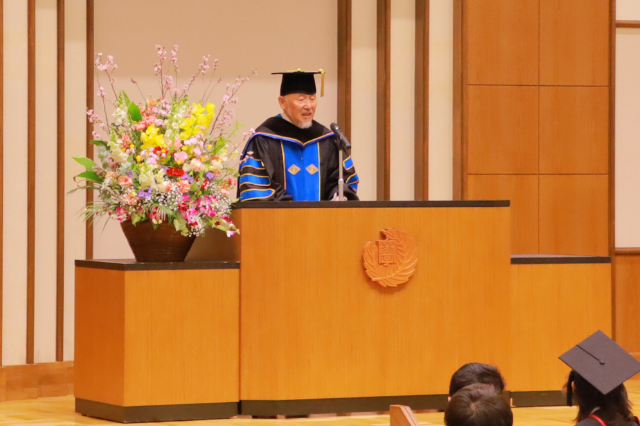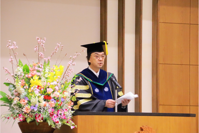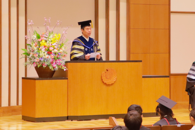On the day of the event, with the participation of Kazuhiro Chiba President and other related parties, 43 people (including 7 doctoral dissertationists) attended. Diplomas were awarded, and a speech from President Chiba was followed by a reply from the graduates.