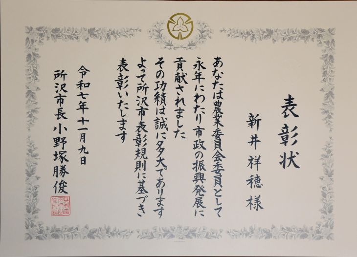 Institute of Agriculture Division of Studies in Sustainable and Symbiotic Society Professor Sachiho Arai received the "Tokorozawa City Meritorious Service Award for Reiwa 7" on November 9, 2025.