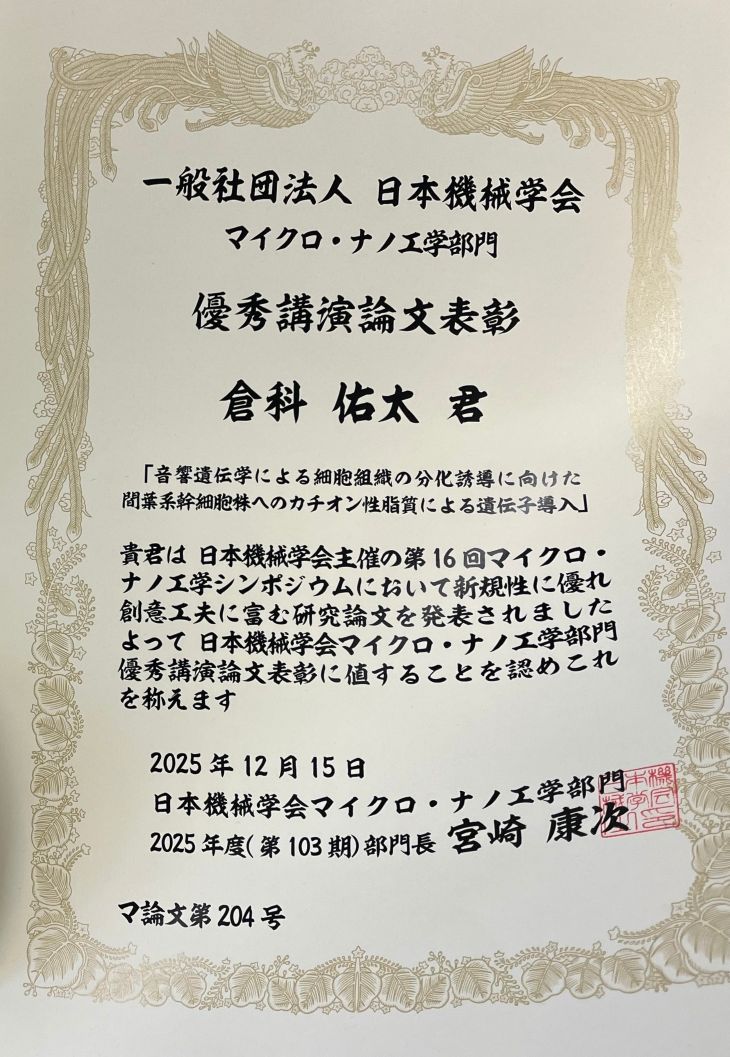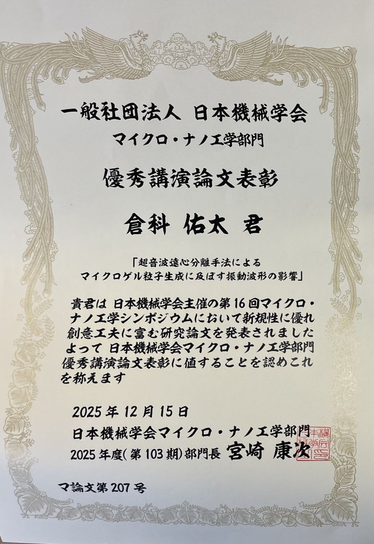 Institute of Engineering Division of Advanced Mechanical Systems Engineering Yuta Kurashina, Associate Professor, received two awards from the Japan Society of Mechanical Engineers for Outstanding Presentations in Micro and Nano Faculty of Engineering on December 15, 2025.