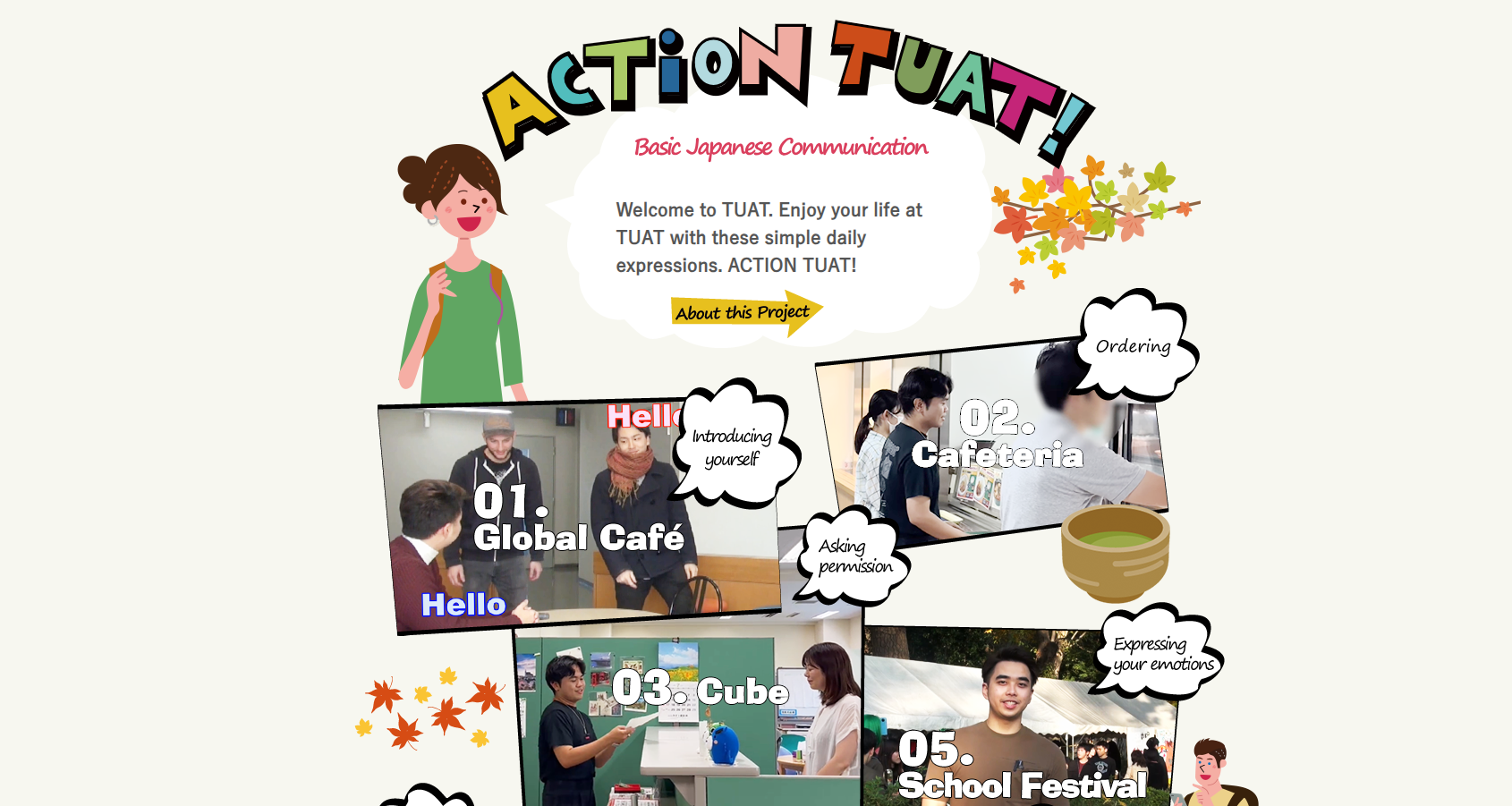 留学生の皆さんが、日本で生活する中で経験しそうな場面を動画で紹介しています。日本語でのコミュニケーションを体験することができます。