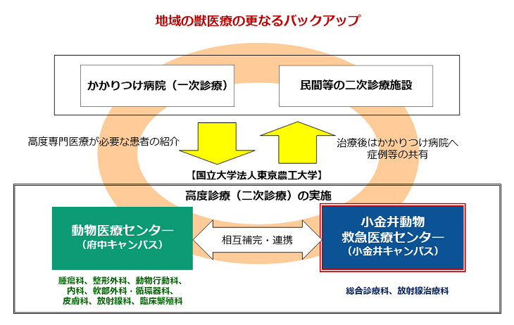 • 本学の動物病院は、かかりつけ病院(一次診療機関)からの紹介を受けて診療を行う「二次診療機関」として機能しており、府中キャンパスにある「動物医療センター」では専門的な医療を、「小金井動物救急医療センター」では総合診療および放射線治療を担います。これら2つのセンターが役割を分担し、相互に連携することで、多様化・高度化する獣医療ニーズに的確に対応しています(図2)。