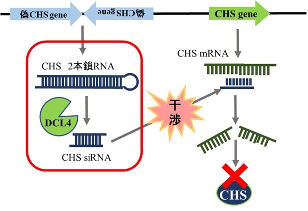 逆位反復配列構造の偽CHS(注6)遺伝子座から2本鎖RNAが転写され、ダイサーDCL4により切断されて21塩基の小分子RNA (siRNA)が生成される。このsiRNAによりCHS遺伝子座から転写されるmRNAを分解するRNA干渉(PTGS)が誘導され、CHSが合成されない。その結果、黄色品種の種皮および2色品種の種皮外縁部では、アントシアニンが合成されない。