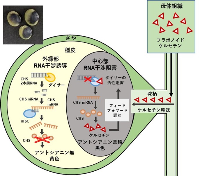 母体組織から珠柄を介して輸送されたケルセチンなどのフラボノイドアグリコン(注9)が未熟種皮の「へそ」周辺に蓄積し、ダイサーDCL4の2本鎖RNA切断活性を阻害することによりRNA干渉が阻害されアントシアニンが蓄積し黒色を呈する。一度RNA干渉が阻害されるとフラボノイド生合成が再開され、より多くのフラボノイドアグリコンが蓄積し、RNA干渉の阻害(アントシアニンの生合成)が維持(確立)される。一方、未熟種皮の外縁部は珠柄から離れており、母体から輸送されるフラボノイドアグリコンが少なくダイサーDCL4の活性(RNA干渉)が維持され、アントシアニンが蓄積せず黄色(無色)となる。