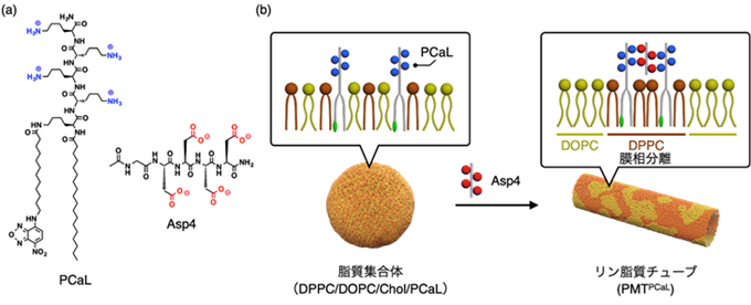 図1 (a) PCaLとAsp4の分子構造、(b) PCaLの集合により引き起こされる膜相分離とリン脂質マイクロチューブ(PMTPCaL)の形成の概略図。