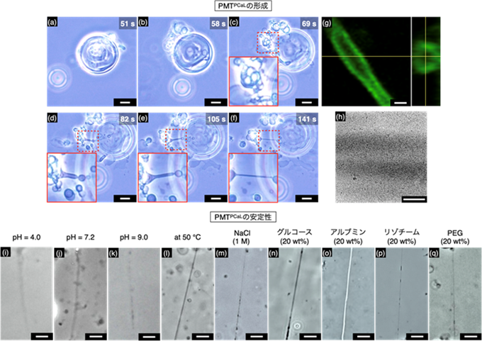 図2 (a–h) PMTPCaL形成における位相差顕微鏡観察画像 (a–f)、共焦点顕微鏡画像 (i,j)、および透過型電子顕微鏡画像 (h) (スケールバーはそれぞれ5 μm、1 μm、200 nm)。(i–o) pH変化 (i-k)、昇温 (l)、高塩濃度 (m)、浸透圧下 (n)、アルブミン共存下 (o)、リゾチーム共存下 (p)、PEG存在下 (q) において構造が維持されたPMTPCaLの位相差顕微鏡画像 (スケールバー: 100 μm)。